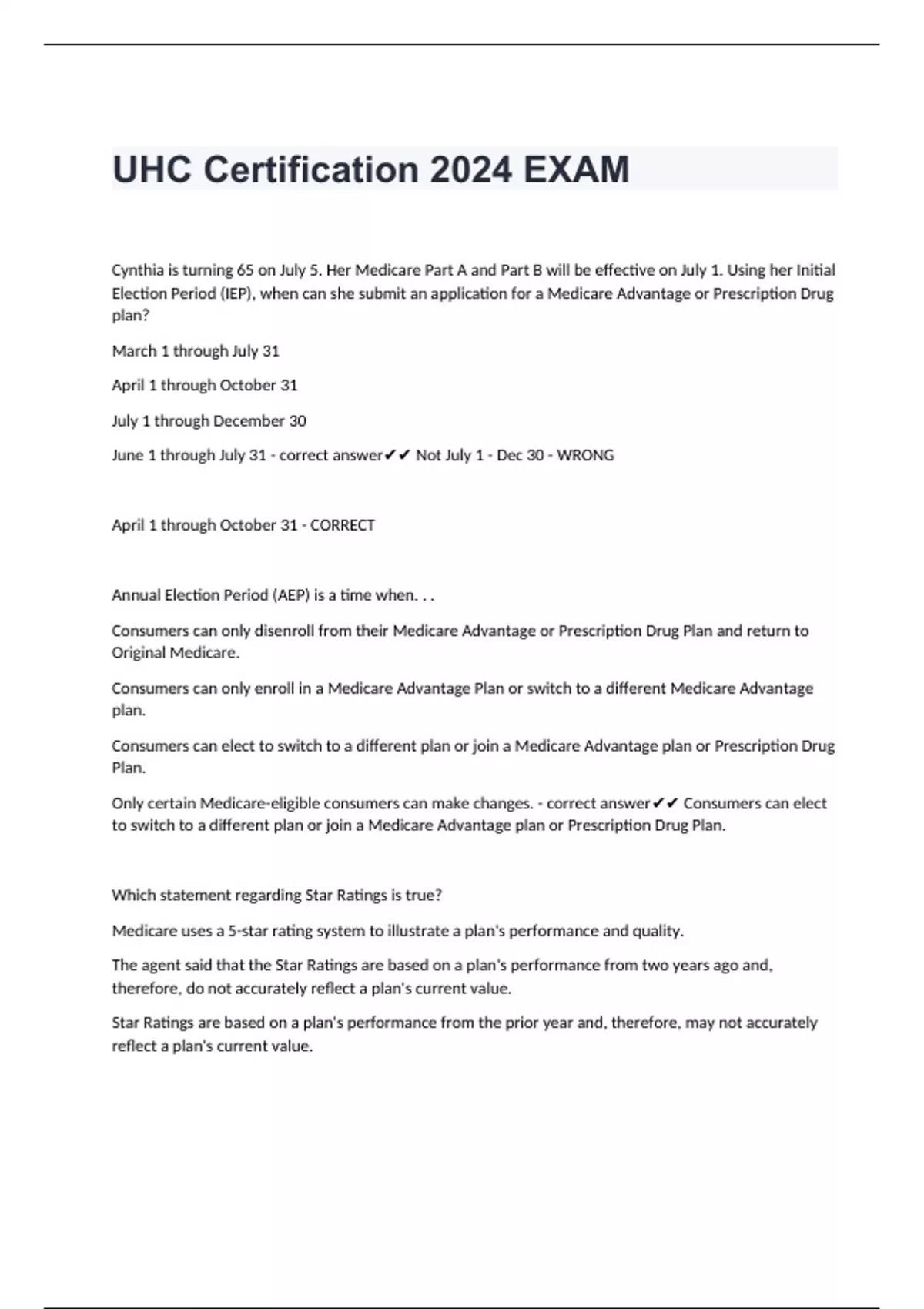 UHC Certification 2024 EXAM Cynthia is turning 65 on July 5. Her Medicare Part A and Part B will be effective on July 1. Using her Initial Election Period (IEP), when can she submit an application for a Medicare Advantage or Prescription Drug plan? March 1 through July 31 April 1 through October 31 July 1 through December 30 June 1 through July 31 - correct answer Not July 1 - Dec 30 - WRONG April 1 through October 31 - CORRECT Annual Election Period (AEP) is a time when. . . Consumers can only disenroll from their Medicare Advantage or Prescription Drug Plan and return to Original Medicare. Consumers can only enroll in a Medicare Advantage Plan or switch to a different Medicare Advantage plan. Consumers can elect to switch to a different plan or join a Medicare Advantage plan or Prescription Drug Plan. Only certain Medicare-eligible consumers can make changes. - correct answer Consumers can elect to switch to a different plan or join a Medicare Advantage plan or Prescription Drug Plan. Which statement regarding Star Ratings is true? Medicare uses a 5-star rating system to illustrate a plan's performance and quality. The agent said that the Star Ratings are based on a plan's performance from two years ago and, therefore, do not accurately reflect a plan's current value. Star Ratings are based on a plan's performance from the prior year and, therefore, may not accurately