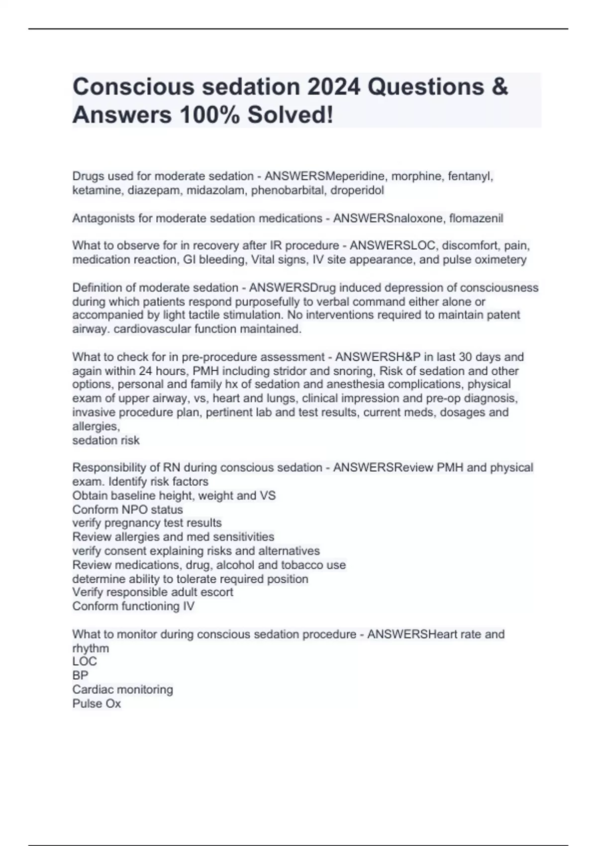 Conscious sedation 2024 Questions & Answers 100% Solved!