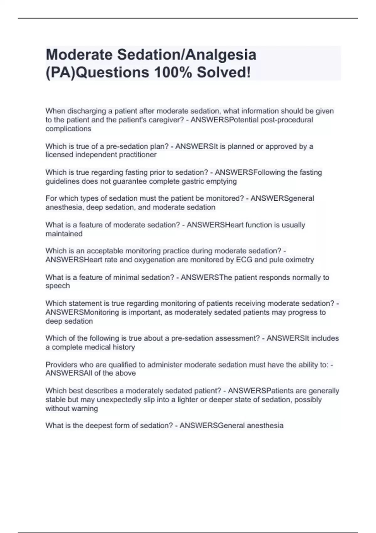Moderate Sedation/Analgesia (PA)Questions 100% Solved!