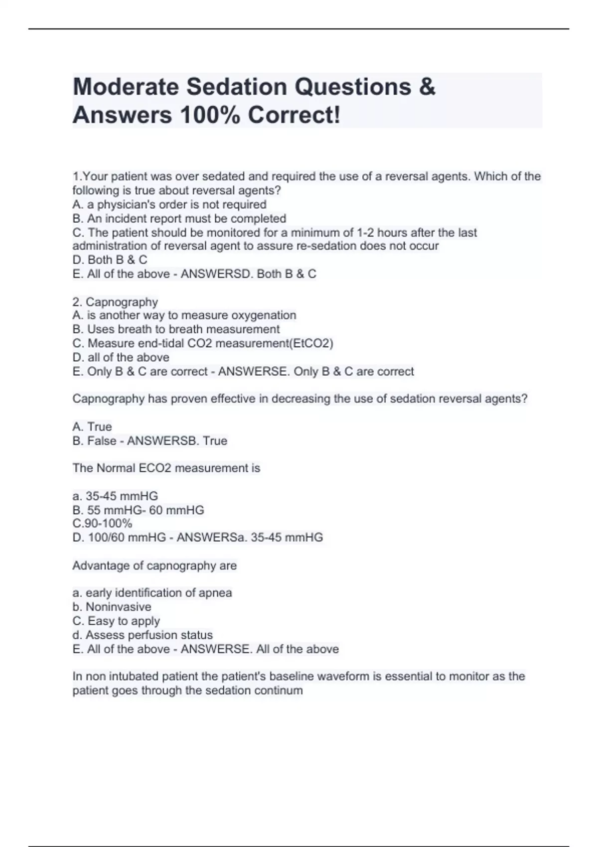 1.Your patient was over sedated and required the use of a reversal agents. Which of the following is true about reversal agents? A. a physician's order is not required B. An incident report must be completed C. The patient should be monitored for a minimum of 1-2 hours after the last administration of reversal agent to assure re-sedation does not occur D. Both B & C E. All of the above - ANSWERSD. Both B & C 2. Capnography A. is another way to measure oxygenation B. Uses breath to breath measurement C. Measure end-tidal CO2 measurement(EtCO2) D. all of the above E. Only B & C are correct - ANSWERSE. Only B & C are correct Capnography has proven effective in decreasing the use of sedation reversal agents? A. True B. False - ANSWERSB. True The Normal ECO2 measurement is a. 35-45 mmHG B. 55 mmHG- 60 mmHG C.90-100% D. 100/60 mmHG - ANSWERSa. 35-45 mmHG Advantage of capnography are a. early identification of apnea b. Noninvasive C. Easy to apply d. Assess perfusion status E. All of the above - ANSWERSE. All of the above In non intubated patient the patient's baseline waveform is essential to monitor as the patient goes through the sedation continum A. True B. False - ANSWERSTrue A patient is having a procedure where procedural sedation is being administered and capnography is being used. The patient's values have been stable throughout the procedure and then suddenly goes to zero. The initial response would be : A. Call a rapid response B. Check the patient C. Ensure the equipment is still connected to the patient D. Both B & C - ANSWERSD. Both B & C Prior to discharge , which of the following is NOT recommended? A. Use the teach back method B. Let the patient drive home C. Document discharge education D. Consider providing discharge education before sedation and reinforce at time of discharge - ANSWERSB. Let the patient drive home Which of the following may severely restrict a patient's ability to maintain adequate