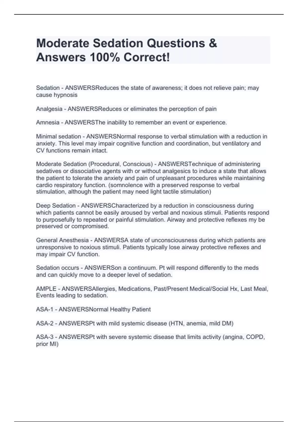 Sedation - ANSWERSReduces the state of awareness; it does not relieve pain; may cause hypnosis Analgesia - ANSWERSReduces or eliminates the perception of pain Amnesia - ANSWERSThe inability to remember an event or experience. Minimal sedation - ANSWERSNormal response to verbal stimulation with a reduction in anxiety. This level may impair cognitive function and coordination, but ventilatory and CV functions remain intact. Moderate Sedation (Procedural, Conscious) - ANSWERSTechnique of administering sedatives or dissociative agents with or without analgesics to induce a state that allows the patient to tolerate the anxiety and pain of unpleasant procedures while maintaining cardio respiratory function. (somnolence with a preserved response to verbal stimulation, although the patient may need light tactile stimulation) Deep Sedation - ANSWERSCharacterized by a reduction in consciousness during which patients cannot be easily aroused by verbal and noxious stimuli. Patients respond to purposefully to repeated or painful stimulation. Airway and protective reflexes my be preserved or compromised. General Anesthesia - ANSWERSA state of unconsciousness during which patients are unresponsive to noxious stimuli. Patients typically lose airway protective reflexes and may impair CV function. Sedation occurs - ANSWERSon a continuum. Pt will respond differently to the meds and can quickly move to a deeper level of sedation. AMPLE - ANSWERSAllergies, Medications, Past/Present Medical/Social Hx, Last Meal, Events leading to sedation. ASA-1 - ANSWERSNormal Healthy Patient ASA-2 - ANSWERSPt with mild systemic disease (HTN, anemia, mild DM) ASA-3 - ANSWERSPt with severe systemic disease that limits activity (angina, COPD, prior MI)