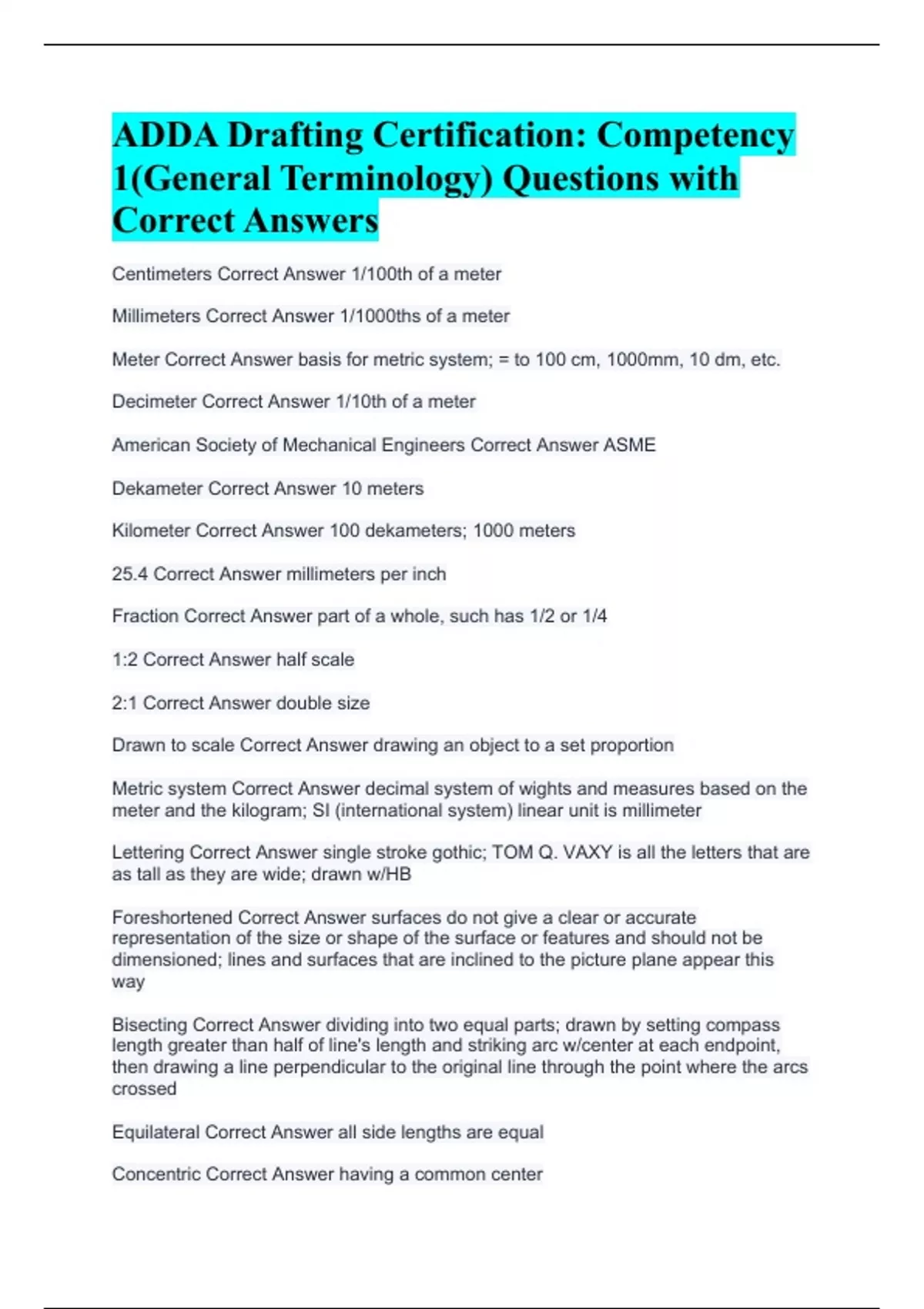 ADDA Drafting Certification: Competency 1(General Terminology) Questions with Correct Answers