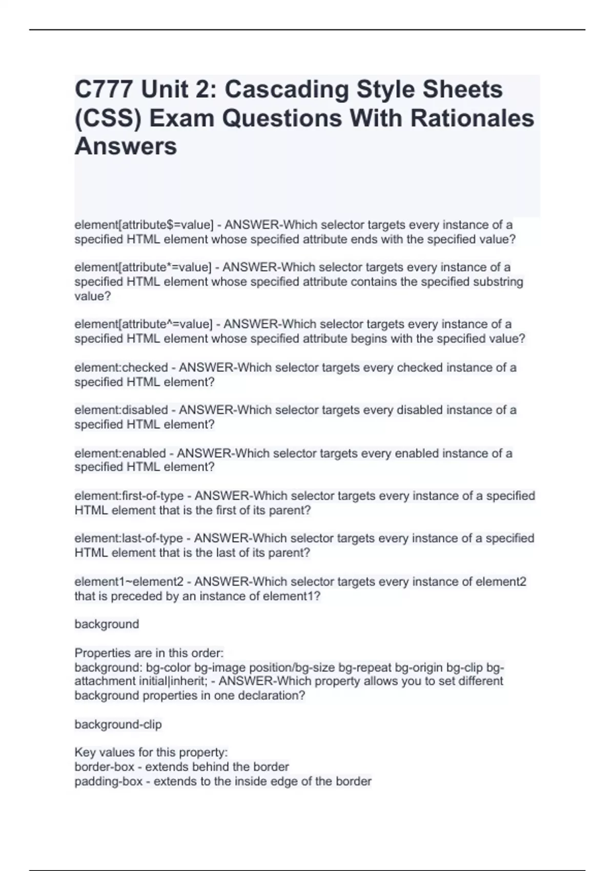 element[attribute*=value] - ANSWER-Which selector targets every instance of a specified HTML element whose specified attribute contains the specified substring value? element[attribute^=value] - ANSWER-Which selector targets every instance of a specified HTML element whose specified attribute begins with the specified value? element:checked - ANSWER-Which selector targets every checked instance of a specified HTML element? element:disabled - ANSWER-Which selector targets every disabled instance of a specified HTML element? element:enabled - ANSWER-Which selector targets every enabled instance of a specified HTML element? element:first-of-type - ANSWER-Which selector targets every instance of a specified HTML element that is the first of its parent? element:last-of-type - ANSWER-Which selector targets every instance of a specified HTML element that is the last of its parent? element1~element2 - ANSWER-Which selector targets every instance of element2 that is preceded by an instance of element1? background Properties are in this order: background: bg-color bg-image position/bg-size bg-repeat bg-origin bg-clip bg-attachment initial|inherit; - ANSWER-Which property allows you to set different background properties in one declaration? background-clip Key values for this property: border-box - extends behind the border padding-box - extends to the inside edge of the border