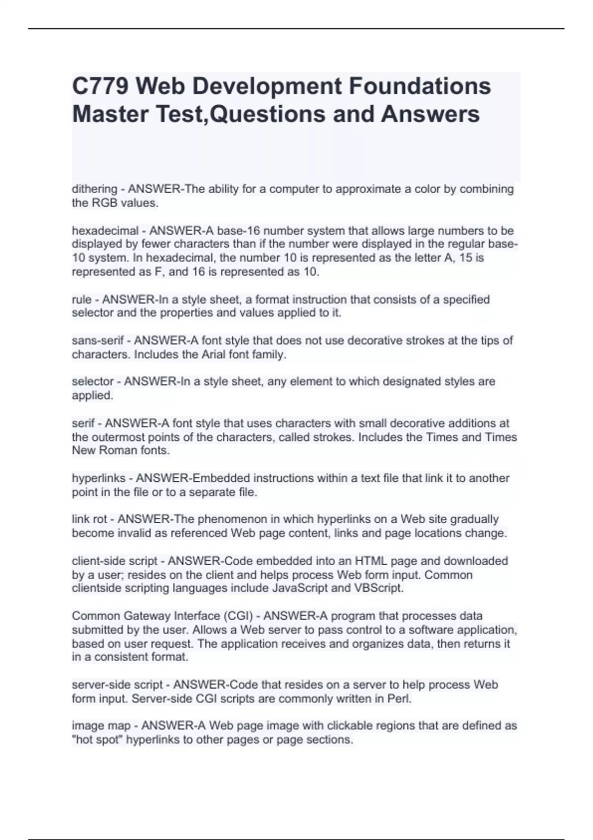 hexadecimal - ANSWER-A base-16 number system that allows large numbers to be displayed by fewer characters than if the number were displayed in the regular base- 10 system. In hexadecimal, the number 10 is represented as the letter A, 15 is represented as F, and 16 is represented as 10. rule - ANSWER-In a style sheet, a format instruction that consists of a specified selector and the properties and values applied to it. sans-serif - ANSWER-A font style that does not use decorative strokes at the tips of characters. Includes the Arial font family. selector - ANSWER-In a style sheet, any element to which designated styles are applied. serif - ANSWER-A font style that uses characters with small decorative additions at the outermost points of the characters, called strokes. Includes the Times and Times New Roman fonts. hyperlinks - ANSWER-Embedded instructions within a text file that link it to another point in the file or to a separate file. link rot - ANSWER-The phenomenon in which hyperlinks on a Web site gradually become invalid as referenced Web page content, links and page locations change. client-side script - ANSWER-Code embedded into an HTML page and downloaded by a user; resides on the client and helps process Web form input. Common clientside scripting languages include JavaScript and VBScript. Common Gateway Interface (CGI) - ANSWER-A program that processes data submitted by the user. Allows a Web server to pass control to a software application, based on user request. The application receives and organizes data, then returns it in a consistent format. server-side script - ANSWER-Code that resides on a server to help process Web form input. Server-side CGI scripts are commonly written in Perl. image map - ANSWER-A Web page image with clickable regions that are defined as "hot spot" hyperlinks to other pages or page sections.