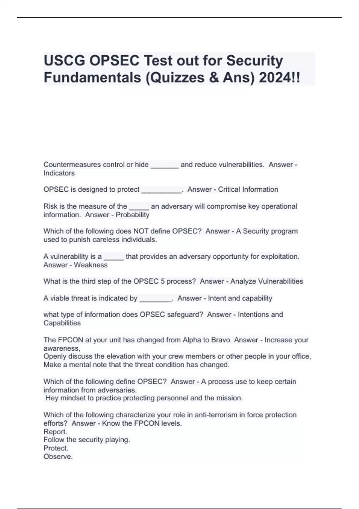 USCG OPSEC Test out for Security Fundamentals (Quizzes & Ans) 2024!!