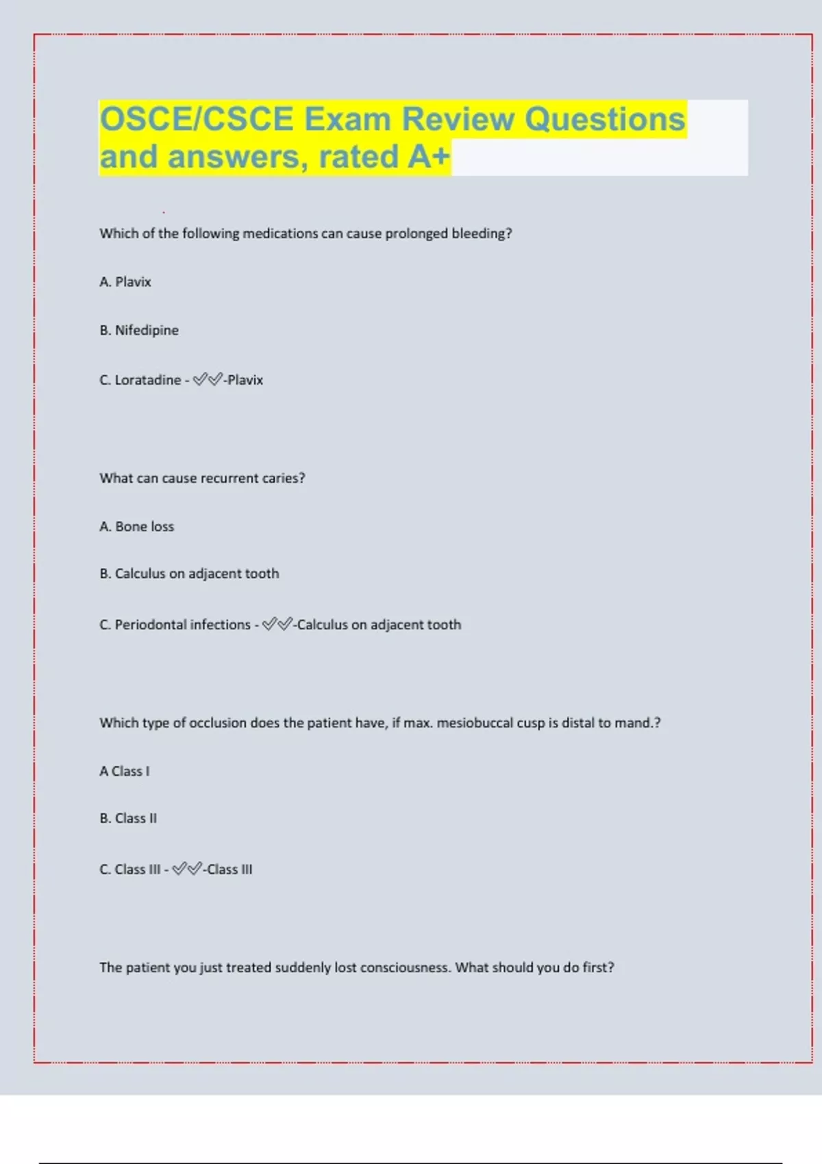 OSCE/CSCE Exam Review Questions and answers, rated A+ Which of the following medications can cause prolonged bleeding? A. Plavix B. Nifedipine C. Loratadine - -Plavix What can cause recurrent caries? A. Bone loss B. Calculus on adjacent tooth C. Periodontal infections - -Calculus on adjacent tooth Which type of occlusion does the patient have, if max. mesiobuccal cusp is distal to mand.? A Class I B. Class II C. Class III - -Class III The patient you just treated suddenly lost consciousness. What should you do first? A. Start chest compression B. Check pulse C. Find an AED D. Start rescue breaths - -Check pulse What type of occlusion does patient have if the max. Mesiobuccal cusp is alined with mand. Mesiobuccal groove? A. Class I B. Class II division 1 C. Class II division 2 D. Class III - -Class I The patient with the max mesiobuccal cusp distal to the mand. Mesiobuccal groove, has what occlusion? A. Class I B. Class II division 1 C. Class II division 2 D. Class III - -Class III The clinician should wash his/her hands for _____ seconds in between patients. A. 10-20 seconds B. 15-25 seconds C. 25-50 seconds D. Over 60 seconds - -15-25 seconds