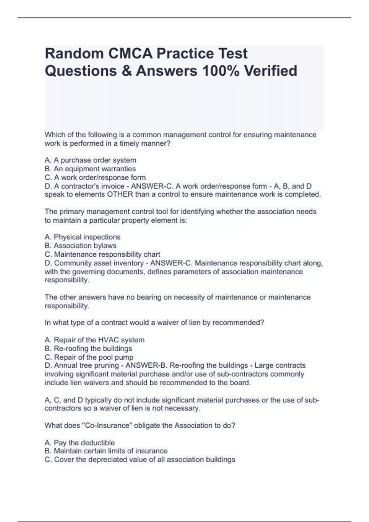 The primary management control tool for identifying whether the association needs to maintain a particular property element is: A. Physical inspections B. Association bylaws C. Maintenance responsibility chart D. Community asset inventory - ANSWER-C. Maintenance responsibility chart along, with the governing documents, defines parameters of association maintenance responsibility. The other answers have no bearing on necessity of maintenance or maintenance responsibility. In what type of a contract would a waiver of lien by recommended? A. Repair of the HVAC system B. Re-roofing the buildings C. Repair of the pool pump D. Annual tree pruning - ANSWER-B. Re-roofing the buildings - Large contracts involving significant material purchase and/or use of sub-contractors commonly include lien waivers and should be recommended to the board. A, C, and D typically do not include significant material purchases or the use of sub-contractors so a waiver of lien is not necessary. What does "Co-Insurance" obligate the Association to do? A. Pay the deductible B. Maintain certain limits of insurance C. Cover the depreciated value of all association buildings D. Provide insurance for homeowners - ANSWER-B. Maintain certain limits of insurance - Co-insurance seeks to the limits of insurance in place at the time of a loss and speaks to insurance obligation for the parties involved in the claim. When an association contracts out all of its services and has no employees, it is a best business practice to: A. Negotiate contracts within the bidding process. B. Purchase employment practices liability insurance. C. Assume the contractors carry their own insurance coverage. D. Increase the coverage under the D&O insurance policy. - ANSWER-A. Negotiate contracts within the bidding process.