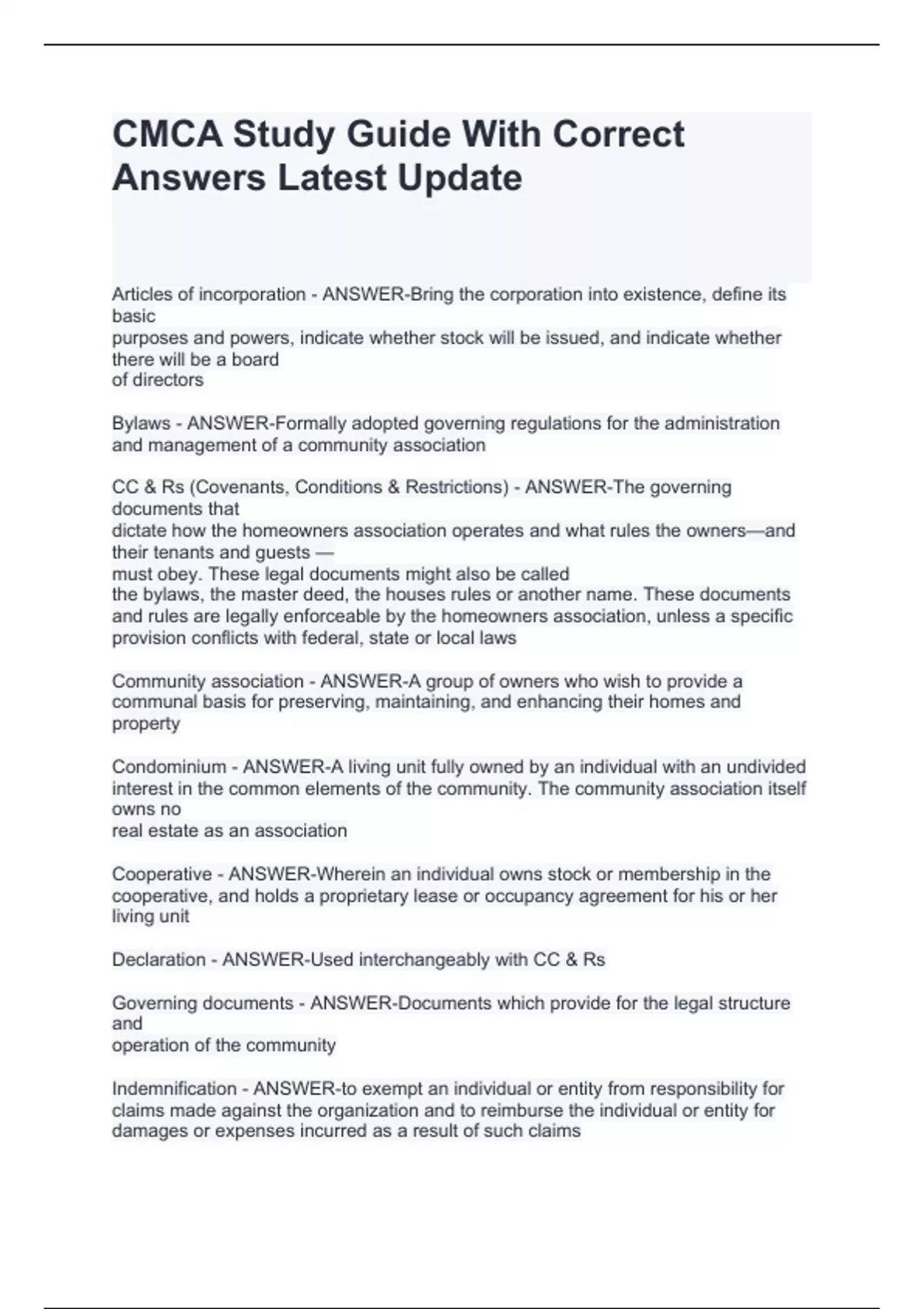 Bylaws - ANSWER-Formally adopted governing regulations for the administration and management of a community association CC & Rs (Covenants, Conditions & Restrictions) - ANSWER-The governing documents that dictate how the homeowners association operates and what rules the owners—and their tenants and guests — must obey. These legal documents might also be called the bylaws, the master deed, the houses rules or another name. These documents and rules are legally enforceable by the homeowners association, unless a specific provision conflicts with federal, state or local laws Community association - ANSWER-A group of owners who wish to provide a communal basis for preserving, maintaining, and enhancing their homes and property Condominium - ANSWER-A living unit fully owned by an individual with an undivided interest in the common elements of the community. The community association itself owns no real estate as an association Cooperative - ANSWER-Wherein an individual owns stock or membership in the cooperative, and holds a proprietary lease or occupancy agreement for his or her living unit Declaration - ANSWER-Used interchangeably with CC & Rs Governing documents - ANSWER-Documents which provide for the legal structure and operation of the community Indemnification - ANSWER-to exempt an individual or entity from responsibility for claims made against the organization and to reimburse the individual or entity for damages or expenses incurred as a result of such claims Master association - ANSWER-An organization of homeowners in a large condominium or planned unit development (PUD) which includes representatives from other, smaller homeowner organizations Mixed use development - ANSWER-A development which is designed to mix two or more "uses" of land together (i.e. a shopping center which offers office space for dentists) Planned community - ANSWER-the most common type of community association, where an owner owns his or her lot and/or living unit and the community owns any common areas, such as tennis courts and roads for the use and benefit of the lot owners
