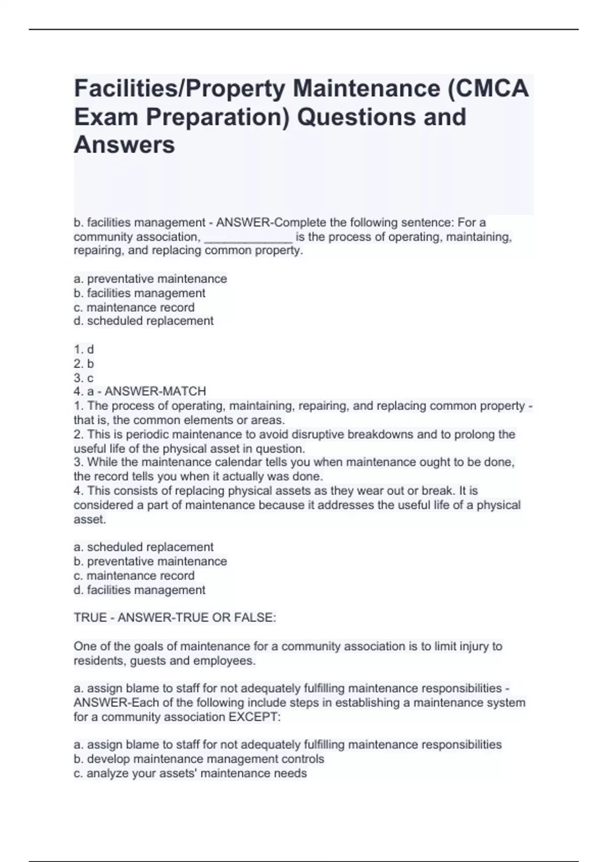 1. d 2. b 3. c 4. a - ANSWER-MATCH 1. The process of operating, maintaining, repairing, and replacing common property - that is, the common elements or areas. 2. This is periodic maintenance to avoid disruptive breakdowns and to prolong the useful life of the physical asset in question. 3. While the maintenance calendar tells you when maintenance ought to be done, the record tells you when it actually was done. 4. This consists of replacing physical assets as they wear out or break. It is considered a part of maintenance because it addresses the useful life of a physical asset. a. scheduled replacement b. preventative maintenance c. maintenance record d. facilities management TRUE - ANSWER-TRUE OR FALSE: One of the goals of maintenance for a community association is to limit injury to residents, guests and employees. a. assign blame to staff for not adequately fulfilling maintenance responsibilities - ANSWER-Each of the following include steps in establishing a maintenance system for a community association EXCEPT: a. assign blame to staff for not adequately fulfilling maintenance responsibilities b. develop maintenance management controls c. analyze your assets' maintenance needs d. evaluate your maintenance system and efforts d. public offering statements - ANSWER-Which of the following is NOT an example of a maintenance management control? a. work orders b. charts of information c. response forms d. public offering statements