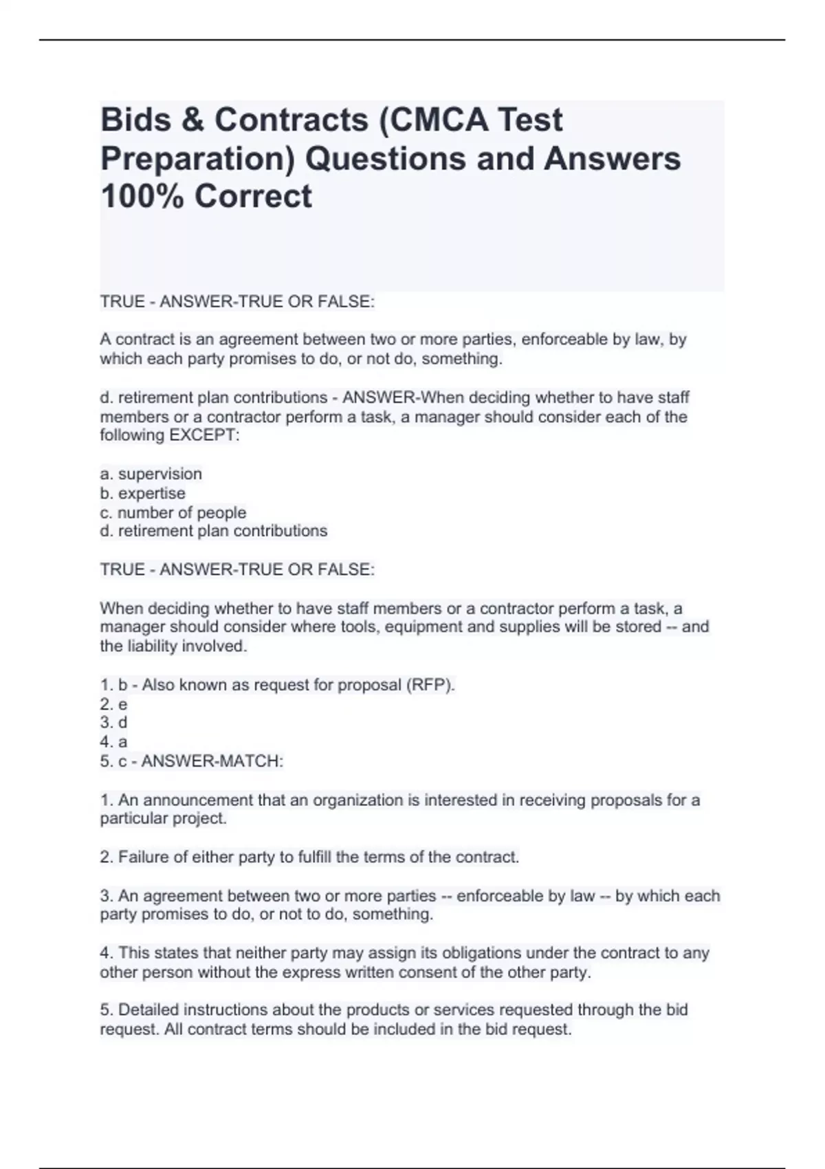 A contract is an agreement between two or more parties, enforceable by law, by which each party promises to do, or not do, something. d. retirement plan contributions - ANSWER-When deciding whether to have staff members or a contractor perform a task, a manager should consider each of the following EXCEPT: a. supervision b. expertise c. number of people d. retirement plan contributions TRUE - ANSWER-TRUE OR FALSE: When deciding whether to have staff members or a contractor perform a task, a manager should consider where tools, equipment and supplies will be stored -- and the liability involved. 1. b - Also known as request for proposal (RFP). 2. e 3. d 4. a 5. c - ANSWER-MATCH: 1. An announcement that an organization is interested in receiving proposals for a particular project. 2. Failure of either party to fulfill the terms of the contract. 3. An agreement between two or more parties -- enforceable by law -- by which each party promises to do, or not to do, something. 4. This states that neither party may assign its obligations under the contract to any other person without the express written consent of the other party. 5. Detailed instructions about the products or services requested through the bid request. All contract terms should be included in the bid request. a. assignability provision b. bid request c. bid specifications d. contract e. default d. entire obligation provision - ANSWER-This states that the written, signed contract constitutes the entire agreement between the parties. a. progress payments b. governing law c. severability provision d. entire obligation provision a. modification provision - ANSWER-This states that the contract may not be modified in any way unless such modification is written and signed by both parties.