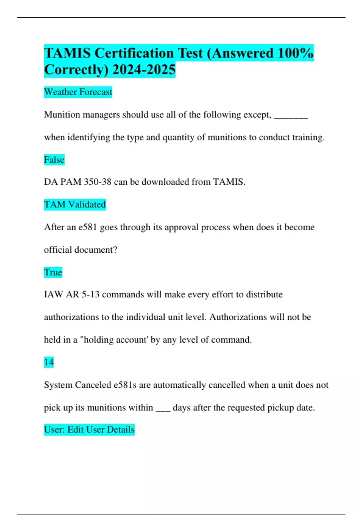 TAMIS Certification Test (Answered 100% Correctly) Weather Forecast Munition managers should use all of the following except, _______ when identifying the type and quantity of munitions to conduct training. False DA PAM 350-38 can be downloaded from TAMIS. TAM Validated After an e581 goes through its approval process when does it become official document? True IAW AR 5-13 commands will make every effort to distribute authorizations to the individual unit level. Authorizations will not be held in a "holding account' by any level of command. 14 System Canceled e581s are automatically cancelled when a unit does not pick up its munitions within ___ days after the requested pickup date.