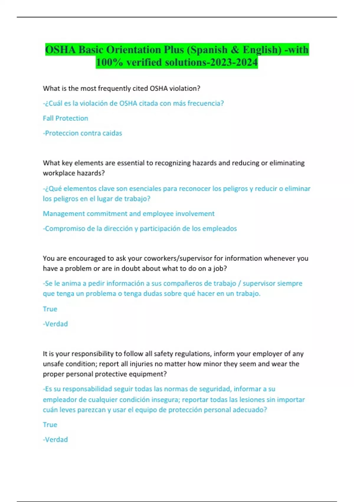 OSHA Basic Orientation Plus (Spanish & English) -with 100% verified solutions-