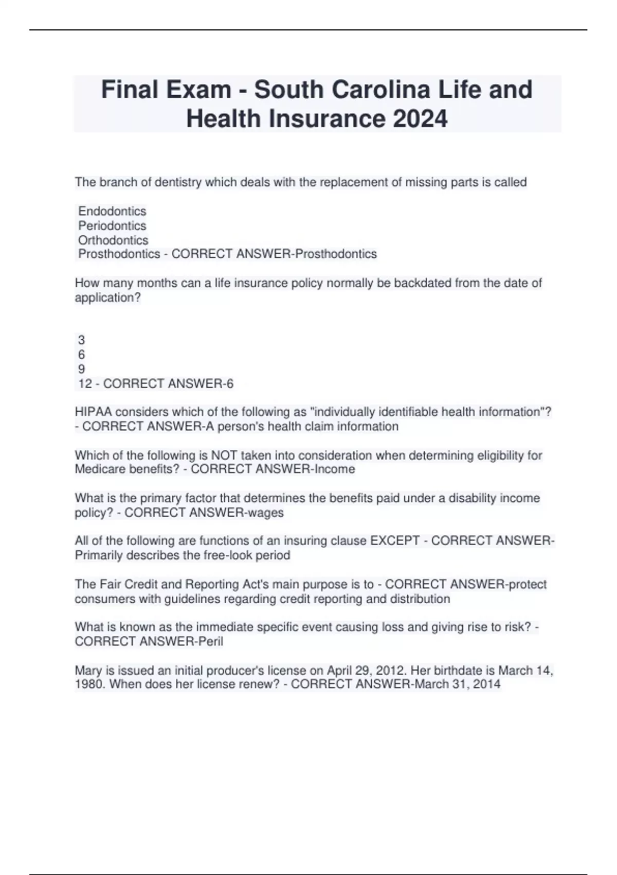 Final Exam - South Carolina Life and Health Insurance 2024 The branch of dentistry which deals with the replacement of missing parts is called Endodontics Periodontics Orthodontics Prosthodontics - CORRECT ANSWER-Prosthodontics How many months can a life insurance policy normally be backdated from the date of application? 3 6 9 12 - CORRECT ANSWER-6 HIPAA considers which of the following as "individually identifiable health information"? - CORRECT ANSWER-A person's health claim information Which of the following is NOT taken into consideration when determining eligibility for Medicare benefits? - CORRECT ANSWER-Income What is the primary factor that determines the benefits paid under a disability income policy? - CORRECT ANSWER-wages All of the following are functions of an insuring clause EXCEPT - CORRECT ANSWERPrimarily describes the free-look period The Fair Credit and Reporting Act's main purpose is to - CORRECT ANSWER-protect consumers with guidelines regarding credit reporting and distribution What is known as the immediate specific event causing loss and giving rise to risk? - CORRECT ANSWER-Peril Mary is issued an initial producer's license on April 29, 2012. Her birthdate is March 14, 1980. When does her license renew? - CORRECT ANSWER-March 31, 2014 Which approach predicts a person's earning potential and determines how much of that amount would be devoted to dependents? - CORRECT ANSWER-Human life value approach In South Carolina, which of the following statements is TRUE regarding a licensed individual changing his or her legal name? - CORRECT ANSWER-The producer must notify the Department upon changing his or her legal name Which settlement option involves having the proceeds remain with the insurer and earnings paid on a monthly basis to the beneficiary? - CORRECT ANSWER-interest only What would happen if a life insurance applicant is given a conditional receipt from an insurance agent and then dies the next day? - CORRECT ANSWER-Claim will be paid if application is approved In South Carolina, what is the MAXIMUM length of time an insurer can defer payment of a cash surrender value of an annuity? - CORRECT ANSWER-6 months Which of these is affected by the frequency of an insurance policy's premium payments? - CORRECT ANSWER-Cost In an insurance contract, the insurer is the only party legally obligated to perform. Because of this, an insurance contract is considered - CORRECT ANSWER-unilateral Which of these licensees MUST be appointed in order to conduct insurance business? - CORRECT ANSWER-Producer A master contract and certificate of coverage can be found in which type of policy? - CORRECT ANSWER-Group Jonas is a whole life insurance policyowner and would like to add coverage for his two children. Which of the following products would allow him to accomplish this? - CORRECT ANSWER-Child term rider The MAXIMUM time period that an eligible employee can be excluded from coverage under a group health policy as a late enrollee is - CORRECT ANSWER-18 months A Medicare Supplement policy must NOT contain be