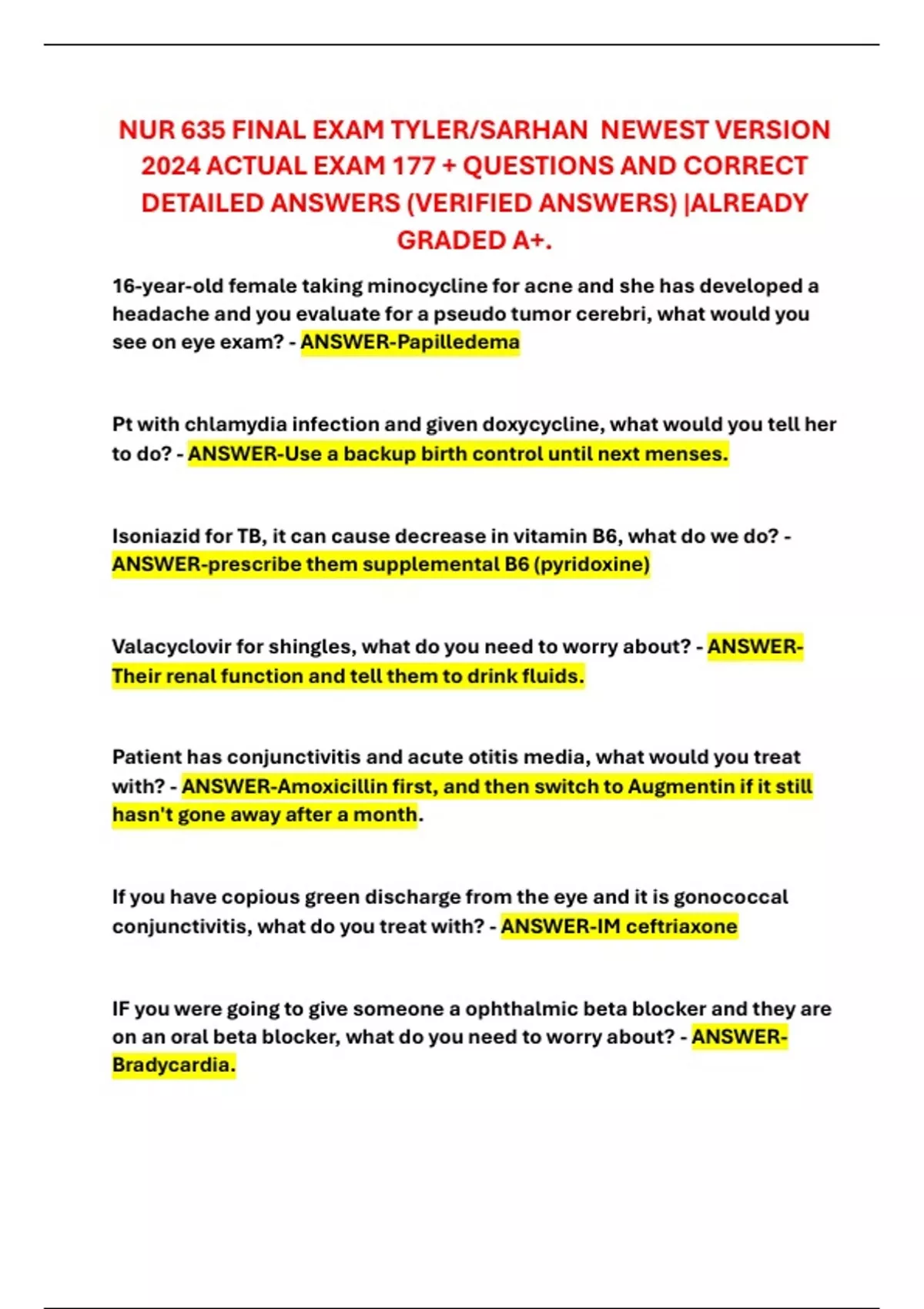 NUR 635 FINAL EXAM TYLER/SARHAN NEWEST VERSION 2024 ACTUAL EXAM 177 + QUESTIONS AND CORRECT DETAILED ANSWERS (VERIFIED ANSWERS) |ALREADY GRADED A+.