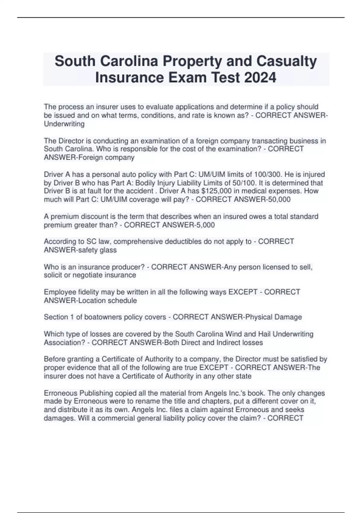 South Carolina Property and Casualty Insurance Exam Test 2024 The process an insurer uses to evaluate applications and determine if a policy should be issued and on what terms, conditions, and rate is known as? - CORRECT ANSWERUnderwriting The Director is conducting an examination of a foreign company transacting business in South Carolina. Who is responsible for the cost of the examination? - CORRECT ANSWER-Foreign company Driver A has a personal auto policy with Part C: UM/UIM limits of 100/300. He is injured by Driver B who has Part A: Bodily Injury Liability Limits of 50/100. It is determined that Driver B is at fault for the accident . Driver A has $125,000 in medical expenses. How much will Part C: UM/UIM coverage will pay? - CORRECT ANSWER-50,000 A premium discount is the term that describes when an insured owes a total standard premium greater than? - CORRECT ANSWER-5,000 According to SC law, comprehensive deductibles do not apply to - CORRECT ANSWER-safety glass Who is an insurance producer? - CORRECT ANSWER-Any person licensed to sell, solicit or negotiate insurance Employee fidelity may be written in all the following ways EXCEPT - CORRECT ANSWER-Location schedule Section 1 of boatowners policy covers - CORRECT ANSWER-Physical Damage Which type of losses are covered by the South Carolina Wind and Hail Underwriting Association? - CORRECT ANSWER-Both Direct and Indirect losses Before granting a Certificate of Authority to a company, the Director must be satisfied by proper evidence that all of the following are true EXCEPT - CORRECT ANSWER-The insurer does not have a Certificate of Authority in any other state Erroneous Publishing copied all the material from Angels Inc.'s book. The only changes made by Erroneous were to rename the title and chapters, put a different cover on it, and distribute it as its own. Angels Inc. files a claim against Erroneous and seeks damages. Will a commercial general liability policy cover the claim? - CORRECT ANSWER-No, because the claim results from copyright infringement and is not in an advertisement When the insured's car was totaled in a recent accident, the ownership of the car was transferred to the insurer. The insurer then sold off the wrecked car to recover some of the loss it paid to the insured. What is the term for this action? - CORRECT ANSWERSalvage The reduction, decrease, or disappearance of value of the person or property insured in a policy by a peril insured against is known as - CORRECT ANSWER-loss A plasterer has finished a job. What kind of liability coverage would protect him if the plaster falls and hurts someone because he did not do the job correctly? - CORRECT ANSWER-Completed operations Which employee fidelity bond pays no more than its limit of liability for each separate occurrence no matter that several separately identifiable employees were involved in a single loss? - CORRECT ANSWER-commercial blanket position If an employee consumes alcohol, becomes intoxicated, and is injured at work, he/she is __________. - CORRECT ANSWER-Not covered if the consumption of alcohol is proven to have caused the injury Under Coverage C of a farm policy, what is the limit payable on business property located away from the premises? - CORRECT ANSWER-$500 Within how many days of requesting an investigative consumer report must an insurer notify the consumer in writing that the report will be obtained? - CORRECT ANSWER-5 days What is the purpose of the government crime coverage form? - CORRECT ANSWERTo provide crime coverage to those who do not qualify in the normal market Which of the following insurance options would be consid