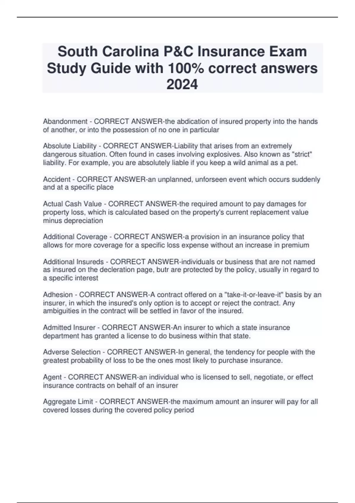 South Carolina P&C Insurance Exam Study Guide with 100% correct answers 2024 Abandonment - CORRECT ANSWER-the abdication of insured property into the hands of another, or into the possession of no one in particular Absolute Liability - CORRECT ANSWER-Liability that arises from an extremely dangerous situation. Often found in cases involving explosives. Also known as "strict" liability. For example, you are absolutely liable if you keep a wild animal as a pet. Accident - CORRECT ANSWER-an unplanned, unforseen event which occurs suddenly and at a specific place Actual Cash Value - CORRECT ANSWER-the required amount to pay damages for property loss, which is calculated based on the property's current replacement value minus depreciation Additional Coverage - CORRECT ANSWER-a provision in an insurance policy that allows for more coverage for a specific loss expense without an increase in premium Additional Insureds - CORRECT ANSWER-individuals or business that are not named as insured on the decleration page, butr are protected by the policy, usually in regard to a specific interest Adhesion - CORRECT ANSWER-A contract offered on a "take-it-or-leave-it" basis by an insurer, in which the insured's only option is to accept or reject the contract. Any ambiguities in the contract will be settled in favor of the insured. Admitted Insurer - CORRECT ANSWER-An insurer to which a state insurance department has granted a license to do business within that state. Adverse Selection - CORRECT ANSWER-In general, the tendency for people with the greatest probability of loss to be the ones most likely to purchase insurance. Agent - CORRECT ANSWER-an individual who is licensed to sell, negotiate, or effect insurance contracts on behalf of an insurer Aggregate Limit - CORRECT ANSWER-the maximum amount an insurer will pay for all covered losses during the covered policy period Agreed Value - CORRECT ANSWER-A property policy with a provision agreed upon by the insurer and insured as to the amount of insurance that represents a fair valuation for the property at the time the insurance is written. Aleatory - CORRECT ANSWER-A contract in which participating parties exchange unequal amounts. the amount the insured will pay in premiums is unequal to the amount the insurer will pay in the event of a loss. Alien Insurer - CORRECT ANSWER-an insurance company that is incorporated outside the U.S. Apparent Authority - CORRECT ANSWER-The appearance or the assumption of authority based on the actions, words, or deeds of the principal or because of circumstances the principal created. Appraisal - CORRECT ANSWER-an assesment of property to determine either the correct amount of insurance to be written or the amount of loss to be paid Arbitration - CORRECT ANSWER-A process, agreed to by parties to a dispute in lieu of going to court, by which a neutral person or body makes a binding decision Assignment - CORRECT ANSWER-the transfer of legal right or interest in an insurance policy, in P&C ususally only valid with prior written consent of the insurer Authorized Insurer - CORRECT ANSWER-An insurance company that has qualified and received a Certificate of Authority from the Department of Insurance to transact insurance in the state. Auto - CORRECT ANSWER-a land motor vehicle, trailer or semi-trailer designed for use on public roads Avoidance - CORRECT ANSWER-A method of dealing with risk by deliberately keeping away from it (e.g. if a person wanted to avoid the risk of being