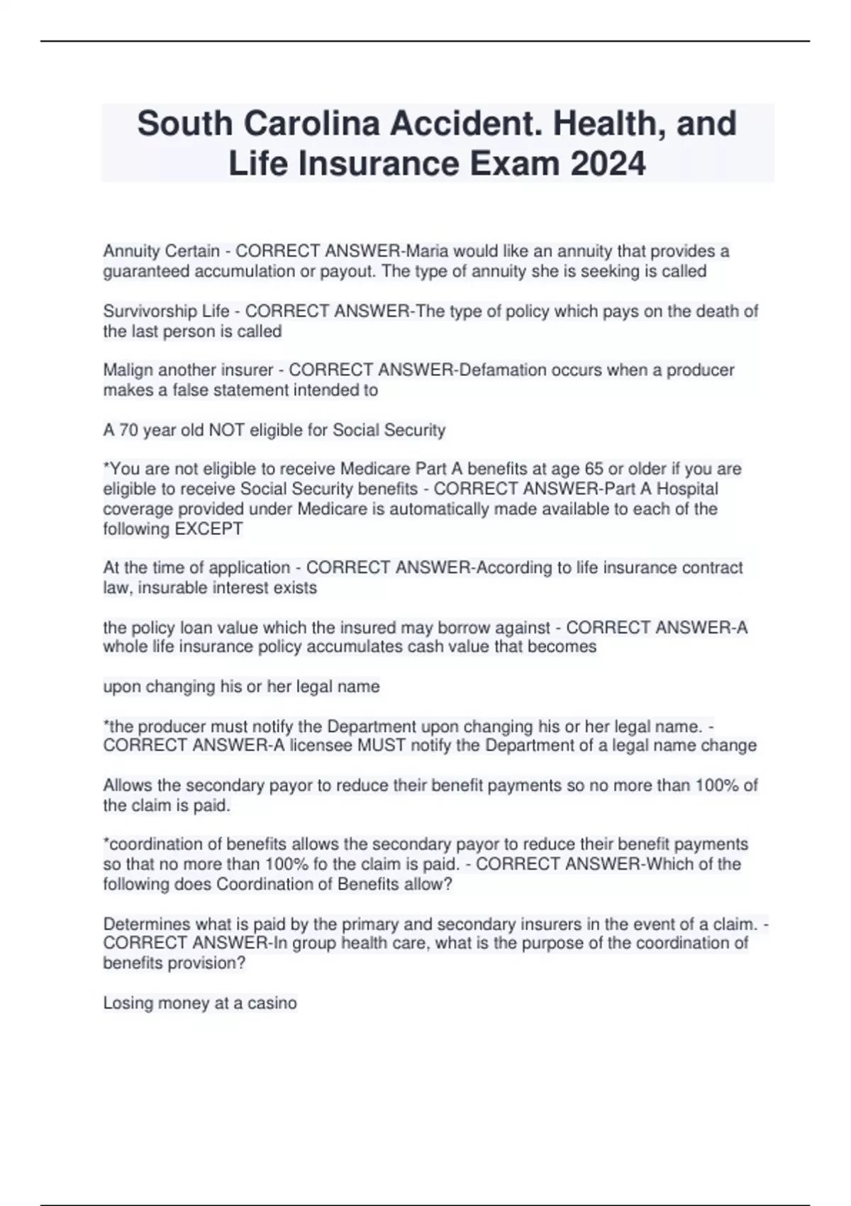South Carolina Accident. Health, and Life Insurance Exam 2024 Annuity Certain - CORRECT ANSWER-Maria would like an annuity that provides a guaranteed accumulation or payout. The type of annuity she is seeking is called Survivorship Life - CORRECT ANSWER-The type of policy which pays on the death of the last person is called Malign another insurer - CORRECT ANSWER-Defamation occurs when a producer makes a false statement intended to A 70 year old NOT eligible for Social Security *You are not eligible to receive Medicare Part A benefits at age 65 or older if you are eligible to receive Social Security benefits - CORRECT ANSWER-Part A Hospital coverage provided under Medicare is automatically made available to each of the following EXCEPT At the time of application - CORRECT ANSWER-According to life insurance contract law, insurable interest exists the policy loan value which the insured may borrow against - CORRECT ANSWER-A whole life insurance policy accumulates cash value that becomes upon changing his or her legal name *the producer must notify the Department upon changing his or her legal name. - CORRECT ANSWER-A licensee MUST notify the Department of a legal name change Allows the secondary payor to reduce their benefit payments so no more than 100% of the claim is paid. *coordination of benefits allows the secondary payor to reduce their benefit payments so that no more than 100% fo the claim is paid. - CORRECT ANSWER-Which of the following does Coordination of Benefits allow? Determines what is paid by the primary and secondary insurers in the event of a claim. - CORRECT ANSWER-In group health care, what is the purpose of the coordination of benefits provision? Losing money at a casino *Pure risk is a category of risk in which loss is the only possible outcome, which is the opposite of speculative risk. Gambling is considered a speculative risk where there is a chance of either gain or loss. - CORRECT ANSWER-All of the following are examples fo pure risk EXCEPT Term Life Insurance - CORRECT ANSWER-Which of the following policies does NOT build cash value? Roth IRA - CORRECT ANSWER-Which of these retirement plans do NOT qualify for a federal income tax deduction? Incontestable Clause - CORRECT ANSWER-Which of the following protects a policy owner from a misrepresentation caused by an innocent mis