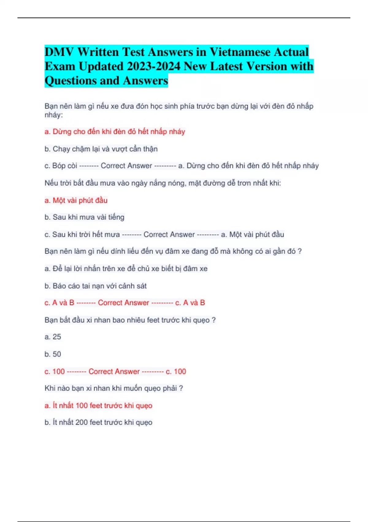DMV Written Test Answers in Vietnamese Actual Exam Updated New Latest Version with Questions and Answers