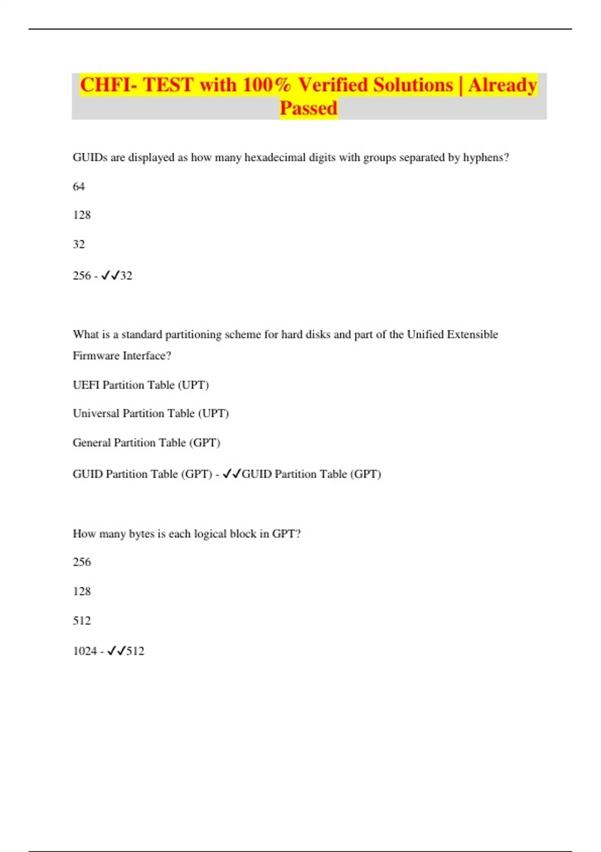 CHFI- TEST with 100% Verified Solutions | Already Passed GUIDs are displayed as how many hexadecimal digits with groups separated by hyphens? 64 128 32 256 - 32 What is a standard partitioning scheme for hard disks and part of the Unified Extensible Firmware Interface? UEFI Partition Table (UPT) Universal Partition Table (UPT) General Partition Table (GPT) GUID Partition Table (GPT) - GUID Partition Table (GPT) How many bytes is each logical block in GPT? 256 128 512 1024 - 512
