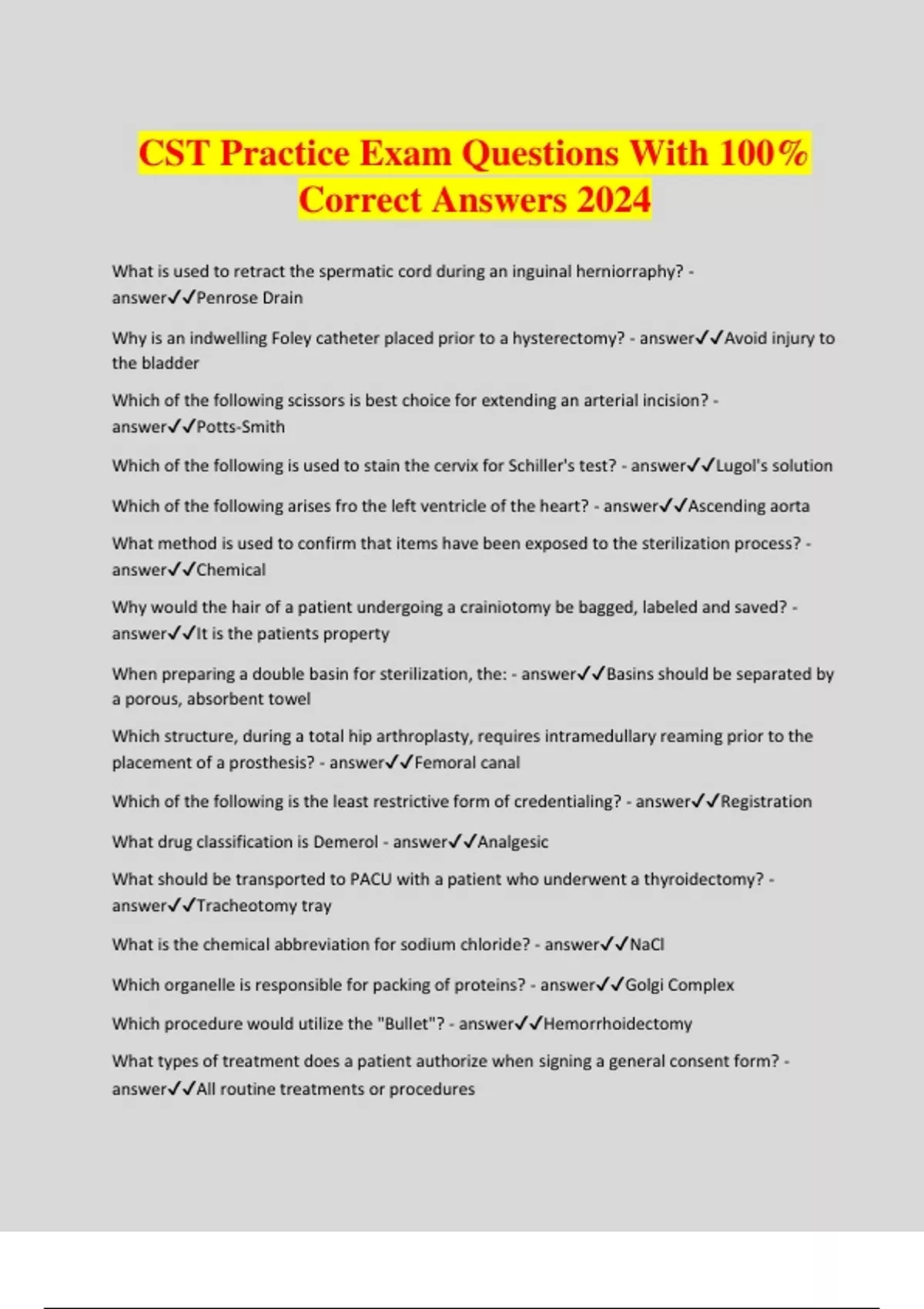 CST Practice Exam Questions With 100% Correct Answers 2024 What is used to retract the spermatic cord during an inguinal herniorraphy? - answerPenrose Drain Why is an indwelling Foley catheter placed prior to a hysterectomy? - answerAvoid injury to the bladder Which of the following scissors is best choice for extending an arterial incision? - answerPotts-Smith Which of the following is used to stain the cervix for Schiller's test? - answerLugol's solution Which of the following arises fro the left ventricle of the heart? - answerAscending aorta What method is used to confirm that items have been exposed to the sterilization process? - answerChemical Why would the hair of a patient undergoing a crainiotomy be bagged, labeled and saved? - answerIt is the patients property When preparing a double basin for sterilization, the: - answerBasins should be separated by a porous, absorbent towel Which structure, during a total hip arthroplasty, requires intramedullary reaming prior to the placement of a prosthesis? - answerFemoral canal Which of the following is the least restrictive form of credentialing? - answerRegistration What drug classification is Demerol - answerAnalgesic What should be transported to PACU with a patient who underwent a thyroidectomy? - answerTracheotomy tray What is the chemical abbreviation for sodium chloride? - answerNaCl Which organelle is responsible for packing of proteins? - answerGolgi Complex Which procedure would utilize the "Bullet"? - answerHemorrhoidectomy What types of treatment does a patient authorize when signing a general consent form? - answerAll routine treatments or procedures Which medication can be used as a topical jelly during cystoscopy procedures? - answerXylocain Which of the following is a primary postoperative complication of carotid endartectomy? - answerStroke During which procedure would the instrument Ferris-Smith be most likely used? - answerMMK (Marshall-Marchetti-Krantz) When is it acceptable to open surgical dressing sponges - answerAfter final count What is the correct procedure to follow when a sterilized rigid instrument container is opened and condensation is observed? - answerDo not use it, return to sterile processing Which method of sterilization requires an aeration cycle? - answerEtO Elevated IOP in glaucoma patients is a result of excess? - answerAqueous humor Where should the grounding pad be placed on a patient undergoing a laparoscopic cholecystectomy who has a right hip prosthesis? - answerLeft anterior thigh An open speculum (Auvgard) is used for what type of procedure? - answerVaginal hysterectomy The Trendelenburg position is often used for surgery on the? - answerLower abdomen and pelvis The large artery that arises from the left side of the aorta and descend into the arm is the: - answerSubclavian Lesions in which part of the brain may affect balance and coordination? - answerCerebellum Which of the following utilized the process of cavitation? - answerUltrasonic cleaner Which of the following is the name for a dorsally angulated fracture of the distal radius? - answerColles' During what procedure would a stone scoop be used? - answerCholecystectomy Which ligament is transected during durgery for De Quervians disease? - answerDorsal carpal In order to minimize mucosal irritation during urinary catherterization, the tip of the catheter is dipped in which of the following? - answerK-Y jelly How often is a medication prescribed as QID to be taken per day? - answer4 times