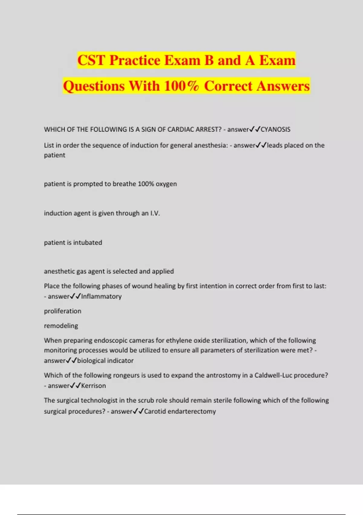 CST Practice Exam B and A Exam Questions With 100% Correct Answers WHICH OF THE FOLLOWING IS A SIGN OF CARDIAC ARREST? - answerCYANOSIS List in order the sequence of induction for general anesthesia: - answerleads placed on the patient patient is prompted to breathe 100% oxygen induction agent is given through an I.V. patient is intubated anesthetic gas agent is selected and applied Place the following phases of wound healing by first intention in correct order from first to last: - answerInflammatory proliferation remodeling When preparing endoscopic cameras for ethylene oxide sterilization, which of the following monitoring processes would be utilized to ensure all parameters of sterilization were met? - answerbiological indicator Which of the following rongeurs is used to expand the antrostomy in a Caldwell-Luc procedure? - answerKerrison The surgical technologist in the scrub role should remain sterile following which of the following surgical procedures? - answerCarotid endarterectomy After gowning and gloving, a surgeon activates the DuraPrep applicator and proceeds to prep the patient for surgery. Which of the following is the BEST action to take at this time? - answerRegown and reglove the surgeon. Local anesthetics containing epinephrine should NEVER be used in which of the following areas? - answerDdigits and penis To prevent contamination at the end of a surgical procedure, which of the following should be removed LAST by the surgical technologist in the scrub role? - answerSurgical gloves During a procedure, a surgical technologist notices a hole in his glove. Which of the following should be done next? - answerChange the glove using the open-gloving technique. Which of the following is an unexpected occurrence that involves physiologic or psychologic injury or death? - answerSentinel event Which of the following is a benign fluid-filled sac that develops in the anterior testis? - answerhydrocele When a cholecystectomy is performed, which of the following anatomical structures must be preserved? - answercommon duct Which of the following procedures treats a congenital obstructed lesion found at the distal end of an infant's stomach? - answerpyloromyotomy When inflating a 5-cc balloon on a Foley catheter, which of the following would be the MOST appropriate choice? - answer8-10 mL of sterile water The tissue that covers bones and provides movement to the skeletal system is - answermuscle. When donning gloves using the open-gloving technique, the ungloved hand will touch the. - answerfolded edge of the cuff of the glove. Which of the following is MOST resistant to sterilization processes? - answerSpore During a herniorrhaphy, the abdominal area that is bound by the rectus abdominis muscle, the inguinal ligament, and the inferior epigastric vessels is the - answerHesselbach triangle. Which of the following instruments may be used to extend the arteriotomy during carotid endarterectomy? - answerPotts-Smith When an anesthetized patient's position is changed from lithotomy to supine, the patient's legs should be lowered slowly to prevent which of the following? - answerHypotension Growth in the length of a long bone occurs at the - answerepiphyseal plate. pad-like sac or cavity that prevents friction within a joint is known as a - answerBursa A resectoscope is used to resect the - answerProstate A cardiac arrest occurs during a procedure, and the surgeon is resuscitating the patient. What is the responsibility of the surgical technologist in the scrub role during this time? - answerRemain sterile and maintain the sterile field. During an abdominoperineal resection, which of the following stapling devices should the surgical technologist have available to form an anal pouch from the ileum? - answerGIA Which of the following is MOST commonly used for wound closure in the presence of infection? - answerStainless steel Herniation of the rectum through a weakened posterior vaginal wall is known as - answerRectocele Which of the following procedures requires an opening into the gallbladder to permit drainage and removal of stones? - answerCholecystostomy If the parents of a dependent minor requiring emergency surgery cannot be located, the operative consent form for surgery may be signed by - answertwo consulting physicians. A 15-year-old girl with anemia will be undergoing an exploratory procedure and a blood transfusion will be necessary. The parents are Jehovah's Witnesses and will not consent to a blood transfusion, but the patient states that she wants the transfusion. The operating room staff reports this to the nurse manager. Which of the following is the BEST course of action now? - answerThe physician or nurse manager should contact the hospital's administration to request that legal counsel becomes involved. A surgical technologist counts only 9 sponges in a pack on the initial count. After recounting the sponges, it is confirmed that there are only 9 sponges in the pack. Which of the following is the appropriate course of action? - answerRemove the current package from the surgical field, but not the operating room; document the problem; open a new package; recount. A pneumatic tourniquet may be used for extremity surgery to - answerreduce blood loss. When utilizing a laparoscopic set-up, potential hazards associated with the equipment include - answerfiberoptic beam fire. The primary reason padding is used in positioning a patient is to - answerprevent injury to pressure points. Which of the following procedures may require a postauricular incision? - answermastoidectomy A patient with multiple trauma injuries requires surgical intervention. The patient has a history of DVT and is currently taking anticoagulants. Which of the following should be done to ensure a clot does not develop? - answerPlace a sequential compression device on lower extremities While speaking to the nurse in the pre-operative area, the patient is crying excessively, pouting, and acting like a child. Whi