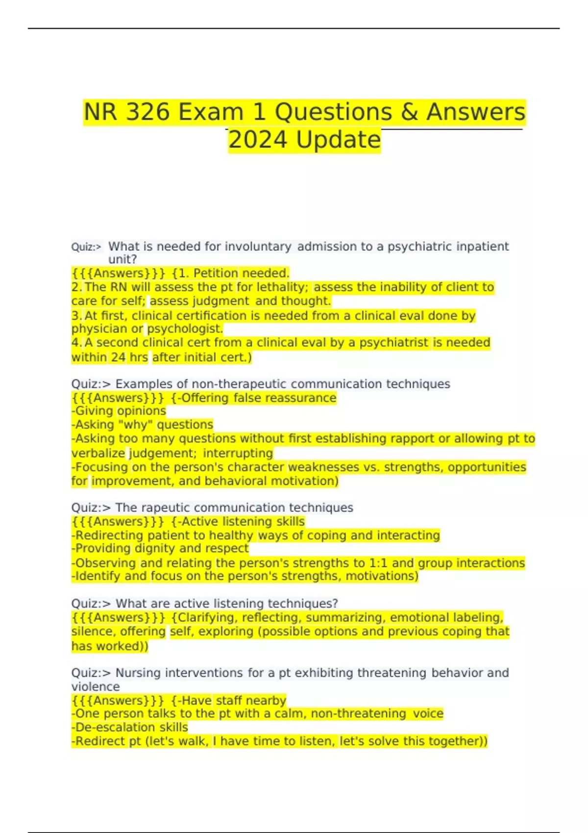 NR 326 Exam 1 Questions & Answers 2024 Update NR 326 Exam 1 Questions & Answers 2024 Update What is needed for involuntary admission to a psychiatric inpatient unit? {{{Answers}}} {1. Petition needed. 2. The RN will assess the pt for lethality; assess the inability of client to care for self; assess judgment and thought. 3. At first, clinical certification is needed from a clinical eval done by physician or psychologist. 4. A second clinical cert from a clinical eval by a psychiatrist is needed within 24 hrs after initial cert.) Quiz:> Examples of non-therapeutic communication techniques {{{Answers}}} {-Offering false reassurance -Giving opinions -Asking "why" questions -Asking too many questions without first establishing rapport or allowing pt to verbalize judgement; interrupting -Focusing on the person's character weaknesses vs. strengths, opportunities for improvement, and behavioral motivation) Quiz:> The rapeutic communication techniques {{{Answers}}} {-Active listening skills -Redirecting patient to healthy ways of coping and interacting -Providing dignity and respect -Observing and relating the person's strengths to 1:1 and group interactions -Identify and focus on the person's strengths, motivations) Quiz:> What are active listening techniques? {{{Answers}}} {Clarifying, reflecting, summarizing, emotional labeling, silence, offering self, exploring (possible options and previous coping that has worked)) Quiz:> Nursing interventions for a pt exhibiting threatening behavior and violence {{{Answers}}} {-Have staff nearby -One person talks to the pt with a calm, non-threatening voice -De-escalation skills -Redirect pt (let's walk, I have time to listen, let's solve this together)) Quiz:> What are your priority actions during a situational crisis? {{{Answers}}} {-Determine if the client has psychotic thinking (Clients experiencing a situational crisis are at greatest risk for injury to themselves or others)) Quiz:> What do you do for a pt exhibiting panic level anxiety? severe anxiety alone. The nurse's priority is to use the least restrictive intervention, such as staying with the pt and calmly encouraging them to express their feelings)) Quiz:> Repression {{{Answers}}} {A patient who just got assaulted and can't remember circumstances of the event) Quiz:> Denial {{{Answers}}} {A nurse manager expects the nurse abusing alcohol to demonstrate the defense mechanism of denial. Denial is the most common defense mechanism, especially used by people dealing with the problems and missed responsibilities associated with substance abuse behavior.) Quiz:> Rationalization {{{Answers}}} {A pt states they have to drink a bottle of alcohol daily to relax due to a veery high stress job. Rationalization is when a person creates reasonable and acceptable explanations for unacceptable behavior.) Quiz:> Somatization {{{Answers}}} {A pt indicates they keep feelings nauseated and sick to their stomach, chest pains, and a headache, every time they are asked to go to art therapy and be with other people (Somatization is developing physical symptoms in place of anxiety)) Quiz:> Reaction formation {{{Answers}}} {A pt dislikes his roommate and speaks ill of him to everyone who will listen; but, when the roommate returns, he offers the roommate a cookie and a snack (Reaction formation is overcompensating or demonstrating the opposite behavior of what the person feels)) Quiz:> Displacement {{{Answers}}} {A pt kicks a chair after emotionally yelling and screaming at a psychiatrist for prescribing a med (displacement is shifting feelings r/t an object, person, or situation to another less threatening object, person, or situation)) Quiz:> Regression {{{Answers}}} {A pt is describing what he does to cope with things not working out the way he expects (Regression is reverting to an earlier, more primitive and child-like pattern of behavior)) Quiz:> What does a crisis situation contain? {{{Answers}}} {A crisis situation contains the potential for psychological growth or deterioration) Quiz:> What may be prescribed for a pt experiencing anxiety? {{{Answers}}} {Paroxetine and Lorazepam (benzo)) Quiz:> Nursing interventions for a pt experiencing a crisis r/t anxiety {{{Answers}}} {-Establish rapport with the pt -Identify the cause of the anxiety -Validate the client's feelings) Quiz:> What are usual findings for panic level anxiety? {{{Answers}}} {Increased pulse rate, respirations, and blood pressure. *Elevated temp and decreased CO2 are not usual findings) Quiz:> What does a nurse do if a pt verbalizes that they are better off dead than alive? {{{Answers}}} {The nurse needs to do a lethality assessment. "Do you have a plan to harm yourself?" (When a pt expresses suicidal intent, it is the nurse's priority to determine the seriousness of the content and the lethali ty of the means.) Quiz:> What is the nurse's priority if the pt has hallucinations, is responding to internal stimuli, and is delusional and/or paranoid? {{{Answers}}} {The nurse's priority is to place the pt on suicide precautions, monitoring within line of sight, or 1:1 supervision/monitoring *Assess TMAPI: thoughts, means, ability, plan, and intent) Quiz:> Nursing interventions for pts who have a history of panic level anxiety {{{Answers}}} {Provide continuity of care by assigning the same staff (consistent interactions are important in any care setting, but especially in mental health. This will help pts establish trust and a sense of seecurity)) Quiz:> What should the nurse do if a pt gets angry and throws a chair? {{{Answers}}} {The first action the nurse should take using the safety/risk reduction priority-setting framework is to attempt to de-escalate the pt's anger and aggression by talking the pt down in a calm, nonthreatening manner.) Quiz:> Give examples of patient rights {{{Answers}}} {•Dignity and Respect • Freedom from Abuse/Neglect • Confidentiality • Access to Record • Environmental Rights • Civil Rights • Treatment and Suppor
