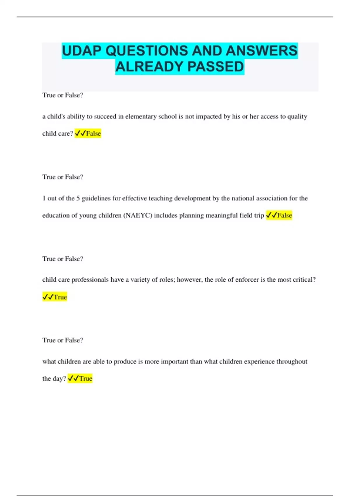 UDAP QUESTIONS AND ANSWERS ALREADY PASSED True or False? a child's ability to succeed in elementary school is not impacted by his or her access to quality child care? False True or False? 1 out of the 5 guidelines for effective teaching development by the national association for the education of young children (NAEYC) includes planning meaningful field trip False True or False? child care professionals have a variety of roles; however, the role of enforcer is the most critical? True True or False? what children are able to produce is more important than what children experience throughout the day? True True or false? quality learning environments consist of two key elements: learning centers and room arrangement? True True or False? since a parent communication board is not used by children, it is not considered an element of quality learning environment? False True or False? building a positive relationships with each child and family with the context of their culture does not apply to children with special needs? False True or False? school aged children are able to play organized games because they are in cooperative stages of play and can create or follow rule? True True or False? teacher intentionally refers to a strategy in which teachers have clearly defined goals for children and thoughtfully prepared environments, experiences and activities to meet those goals? True True or False? children need daily routines and schedules that are flexible, yes consistent and predictable; this instills a sense of order and helps children learn new skills and appropriate behaviors. True True or False? the caregiver's professional development has no direct impact on the everyday quality of the child care you provide? False True or False? an excellent way to bond with families and build trust is to greet parental and children by name as soon as you see them? True True or False? if a young child is not stimulated, synapse are lost and cannot be connected? True True or False? separation plans are only used for parents when they first enroll their children in a child care program? False True or False? research has shown that children exposed