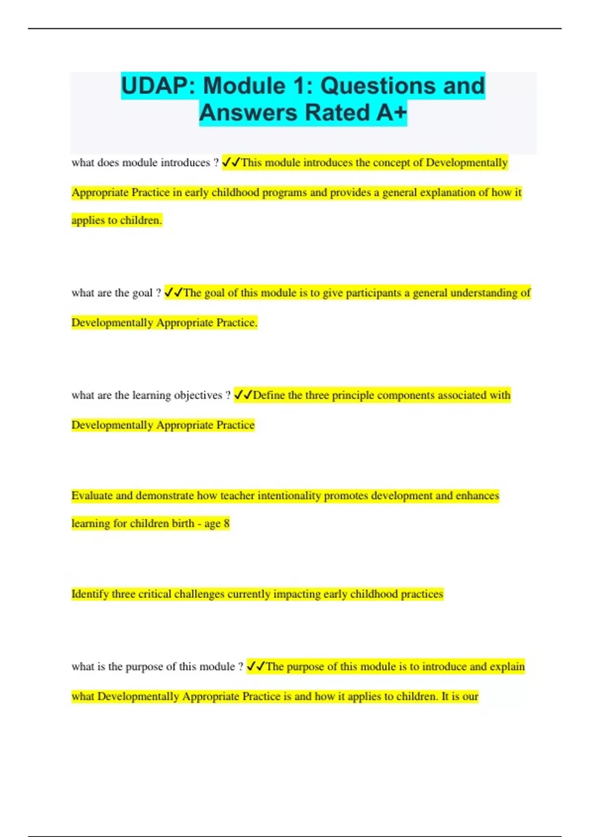 UDAP: Module 1: Questions and Answers Rated A+ what does module introduces ? This module introduces the concept of Developmentally Appropriate Practice in early childhood programs and provides a general explanation of how it applies to children. what are the goal ? The goal of this module is to give participants a general understanding of Developmentally Appropriate Practice. what are the learning objectives ? Define the three principle components associated with Developmentally Appropriate Practice Evaluate and demonstrate how teacher intentionality promotes development and enhances learning for children birth - age 8 Identify three critical challenges currently impacting early childhood practices what is the purpose of this module ? The purpose of this module is to introduce and explain what Developmentally Appropriate Practice is and how it applies to children. It is our professional responsibility to promote and provide quality care and education to every child who comes to us for care. Developmentally Appropriate Practice, or DAP, is a concept developed by the National Association for the Education of Young Children (NAEYC). Developmentally Appropriate Practice focuses on children birth to eight years old and is made up of three principle components: age appropriateness, individual appropriateness, and social/cultural appropriateness. Developmentally Appropriate Practice focuses on children birth through eight years old and is made up of three principle components: age appropriateness, individual appropriateness, and social/cultural appropriateness. Developmentally Appropriate Practice helps teachers improve the effectiveness of their work with children. It helps them make decisions based on what they know about children. Teachers who know how children think and learn recognize that children learn best when they are given many opportunities to explore materials and their environment with their peers and adults. Knowledgeable caregivers are able to build on what children already know and can do, but also make them stretch toward what they don't know yet or are unable to do without help. This idea is critical to understanding and implementing Developmentally Appropriate Practice. Learning a new skill does not happen by chance teachers must know each of the children in their classrooms. They need to be able to identify where they are in all areas of development and then plan for and engage them in a variety of activities that are challenging and achievable Teachers who are grounded in Developmentally Appropriate Practice are able to make critical decisions when selecting materials, supporting interactions, implementing curriculum, and adjusting instruction. Developmentally Appropriate Practice