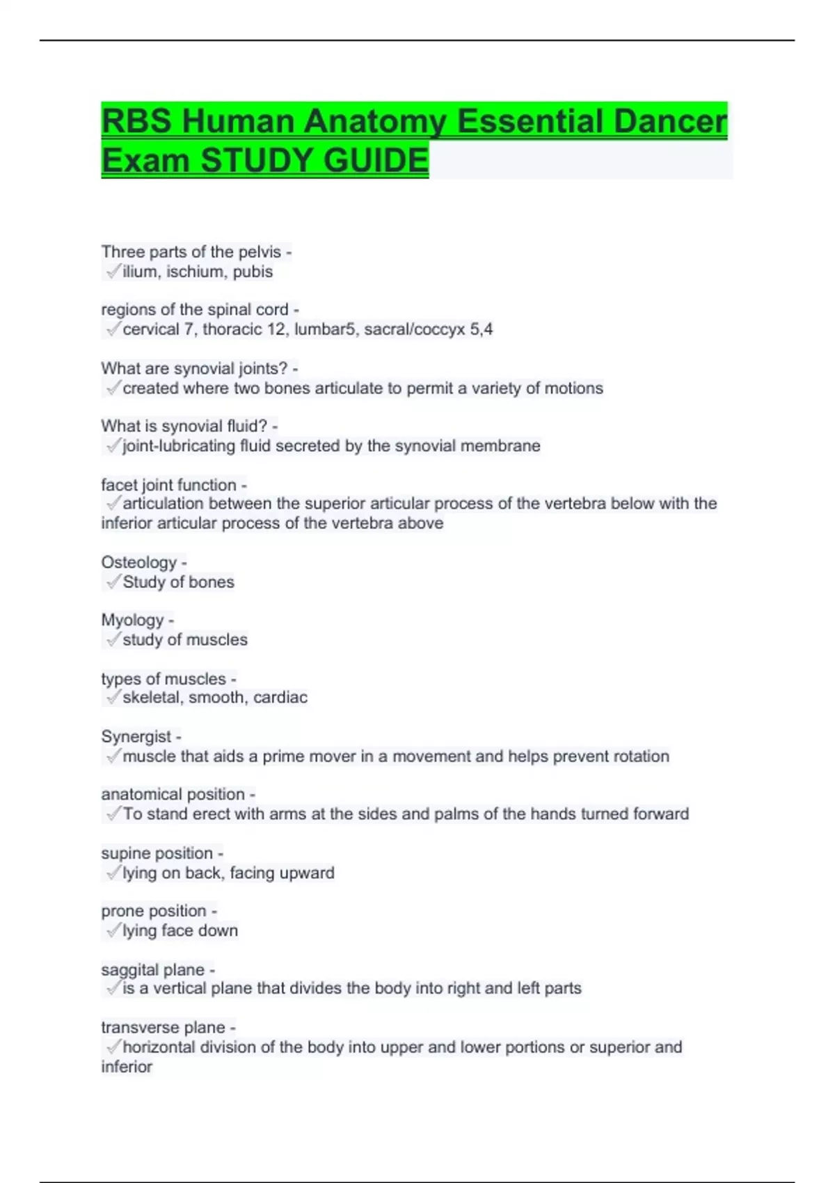 RBS Human Anatomy Essential Dancer Exam STUDY GUIDE.