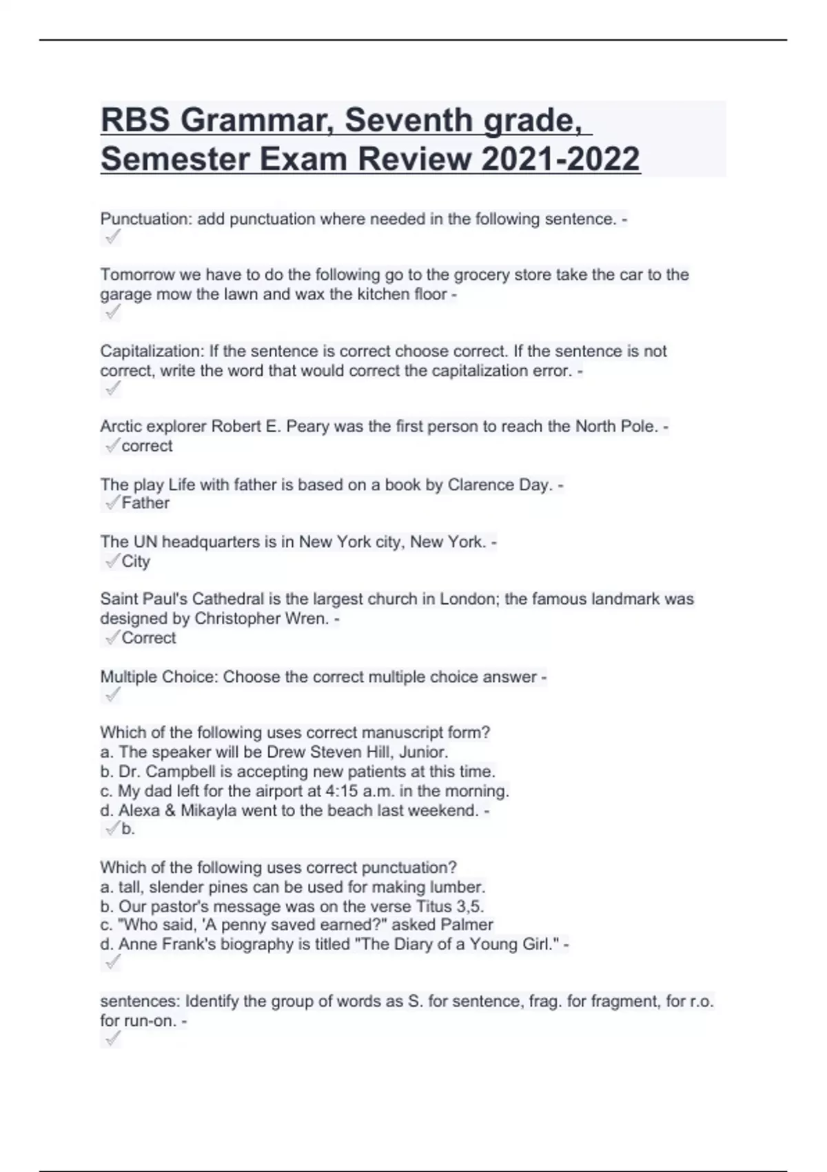 RBS Grammar, Seventh grade, Semester Exam Review .