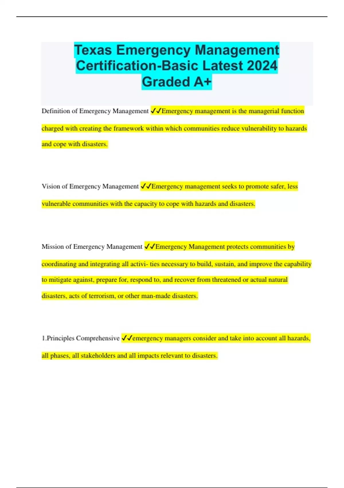 Texas Emergency Management Certification-Basic Latest 2024 Graded A+ Definition of Emergency Management Emergency management is the managerial function charged with creating the framework within which communities reduce vulnerability to hazards and cope with disasters. Vision of Emergency Management Emergency management seeks to promote safer, less vulnerable communities with the capacity to cope with hazards and disasters. Mission of Emergency Management Emergency Management protects communities by coordinating and integrating all activi- ties necessary to build, sustain, and improve the capability to mitigate against, prepare for, respond to, and recover from threatened or actual natural disasters, acts of terrorism, or other man-made disasters. 1.Principles Comprehensive emergency managers consider and take into account all hazards, all phases, all stakeholders and all impacts relevant to disasters. 2. Principles Progressive emergency managers anticipate future disasters and take preventive and preparatory measures to build disaster-resistant and disaster-resilient communities. 3.Principles Risk-Driven emergency managers use sound risk management principles (hazard identification, risk analysis, and impact analysis) in assigning priorities and resources. 4. Principles Integrated emergency managers ensure unity of effort among all levels of govern- ment and all elements of a community. 5. Principles Collaborative emergency managers create and sustain broad and sincere relationships among individuals and organizations to encourage trust, advocate a team atmosphere, build consensus, and facilitate communication. 6. Principles Coordinated "emergency managers synchronize the activities of all relevant stakeholders to achieve a common purpose. 7. Principles Flexible emergency managers use creative and innovative approaches in solving disaster challenges. 8. Principles Professional emergency managers value a science and knowledge-based approach based on education, training, experience, ethical practice, public stewardship and continuous improvement. An important feature of Emergency Operation Plans is that they ________________________________. provide a uniform response to all hazards that a community may face. When a more qualified person arrives on scene, which statement best describes what happens? The more qualified person automatically becomes the new Incident Commander and assumes command. The outgoing Incident Commander demobilizes to avoid confusion. Mutual Aid Agreements ________________________________. assist agencies and jurisdictions when existing resources are inadequate. Predicting the resource needs of an incident to determine the appropriate management structure is referred to as (a): Logistical Analysis