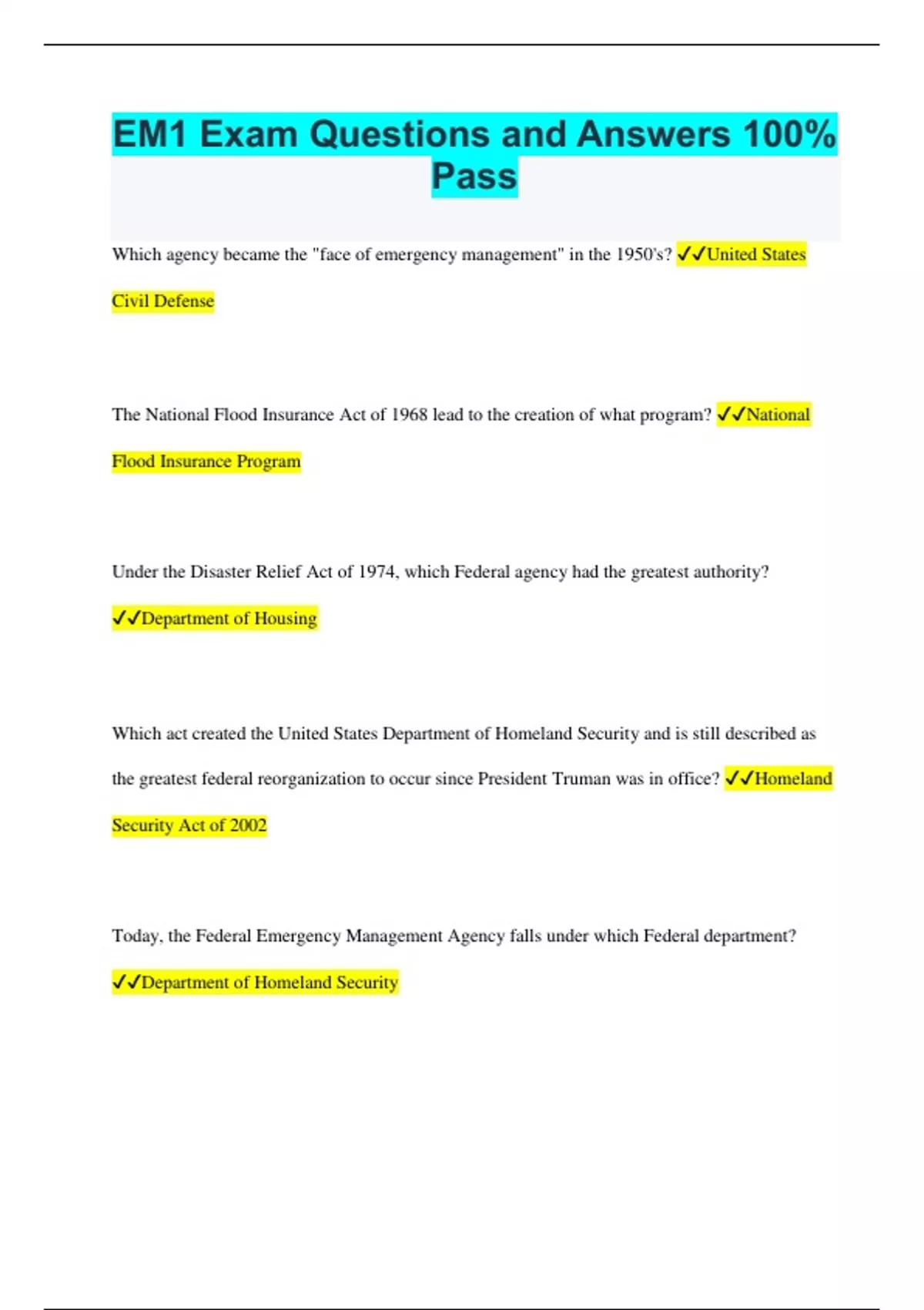 EM1 Exam Questions and Answers 100% Pass Which agency became the "face of emergency management" in the 1950's? United States Civil Defense The National Flood Insurance Act of 1968 lead to the creation of what program? National Flood Insurance Program Under the Disaster Relief Act of 1974, which Federal agency had the greatest authority? Department of Housing Which act created the United States Department of Homeland Security and is still described as the greatest federal reorganization to occur since President Truman was in office? Homeland Security Act of 2002 Today, the Federal Emergency Management Agency falls under which Federal department? Department of Homeland Security What are the four phases or functions of emergency management? Mitigation, Preparedness, Response, Recovery Which phase or function involves reducing or eliminating the probability or the consequences of a hazard, or both? Mitigation What are the two types of mitigation? Structural and Nonstructural What phase or function includes activities, tasks, programs, and systems developed and implemented prior to a disaster that are used to support the prevention of, mitigation of, response to, and recovery from the event? Preparedness Which one of the following is not a preparedness activity? Rebuilding Which phase or function includes activities to preserve life, property, environment, and the social, economic, and political structure of a community? Response Which of the following are response activities? Protection and Restoration of Critical Infrastructure Evacuation and Sheltering Stabilization and Removal of Environmental Hazards Which phase or function includes rebuilding communities so individuals, businesses, and government infrastructure can function on their own, return to normalcy, and are protected against future hazards? Recovery What are the two types of recovery? Short-term and Long-term The Certified Emergency Manager designation is awarded by what institution? International Association of Emergency Managers (IAEM) What structure represents the physical location at which the coordination of information and resources to support incident management activities normally takes place? Emergency Operations Center What structure is a collaborative