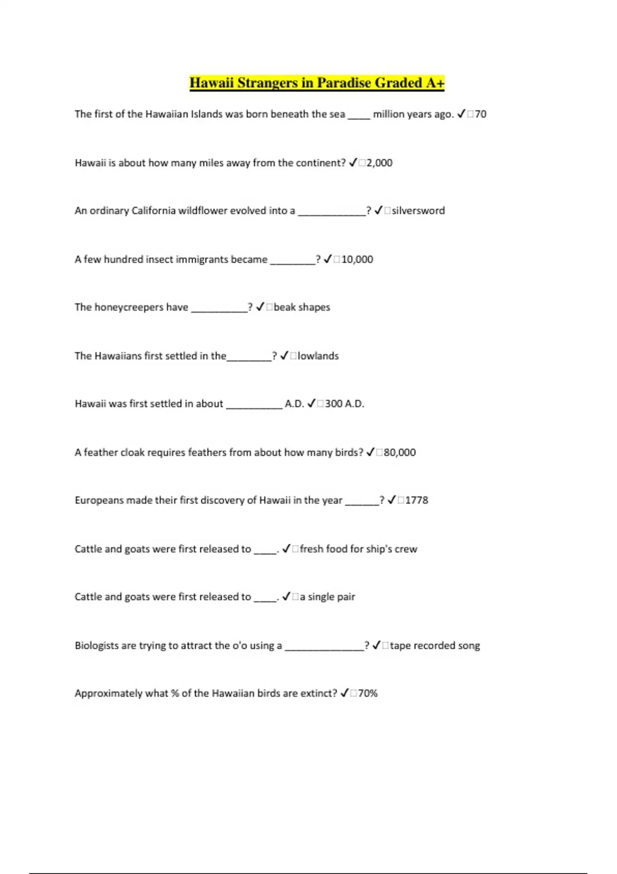 Hawaii Strangers in Paradise Graded A+ The first of the Hawaiian Islands was born beneath the sea ____ million years ago. ️70 Hawaii is about how many miles away from the continent? ️2,000 An ordinary California wildflower evolved into a ____________? ️silversword A few hundred insect immigrants became ________? ️10,000 The honeycreepers have __________? ️beak shapes The Hawaiians first settled in the________? ️lowlands Hawaii was first settled in about __________ A.D. ️300 A.D. A feather cloak requires feathers from about how many birds? ️80,000 Europeans made their first discovery of Hawaii in the year ______? ️1778 Cattle and goats were first released to ____. ️fresh food for ship's crew Cattle and goats were first released to ____. ️a single pair Biologists are trying to attract the o'o using a ______________? ️tape recorded song Approximately what % of the Hawaiian birds are extinct? ️70% Hawaiian picture-wing flies evolved into about how many species? ️800 Hawaii's carnivorous caterpillar will turn into a? ️ordinary looking moth If an ant touches the carnivorous caterpillar, the ant will be ______________? ️caught Mauna Kea is the ____________ mountain in the world? ️tallest Species extinctions have been described as ____ on spaceship Earth. ️popping rivets Biologists pollinating plants on Molokai's sea cliffs are substituting for a missing ______. ️Alien species brough in by humans . Hawaii has one big problem, with many manifestations: ___________________. ️insect Of all the scourges of the native Hawaiian rainforests, the worst is the ___________? ️feral pig Ninety % of Hawaii's turtles migrate to ____________? ️French Frigate Shoals The National Marine Fisheries Service captures and redistributes ____________________. ️m