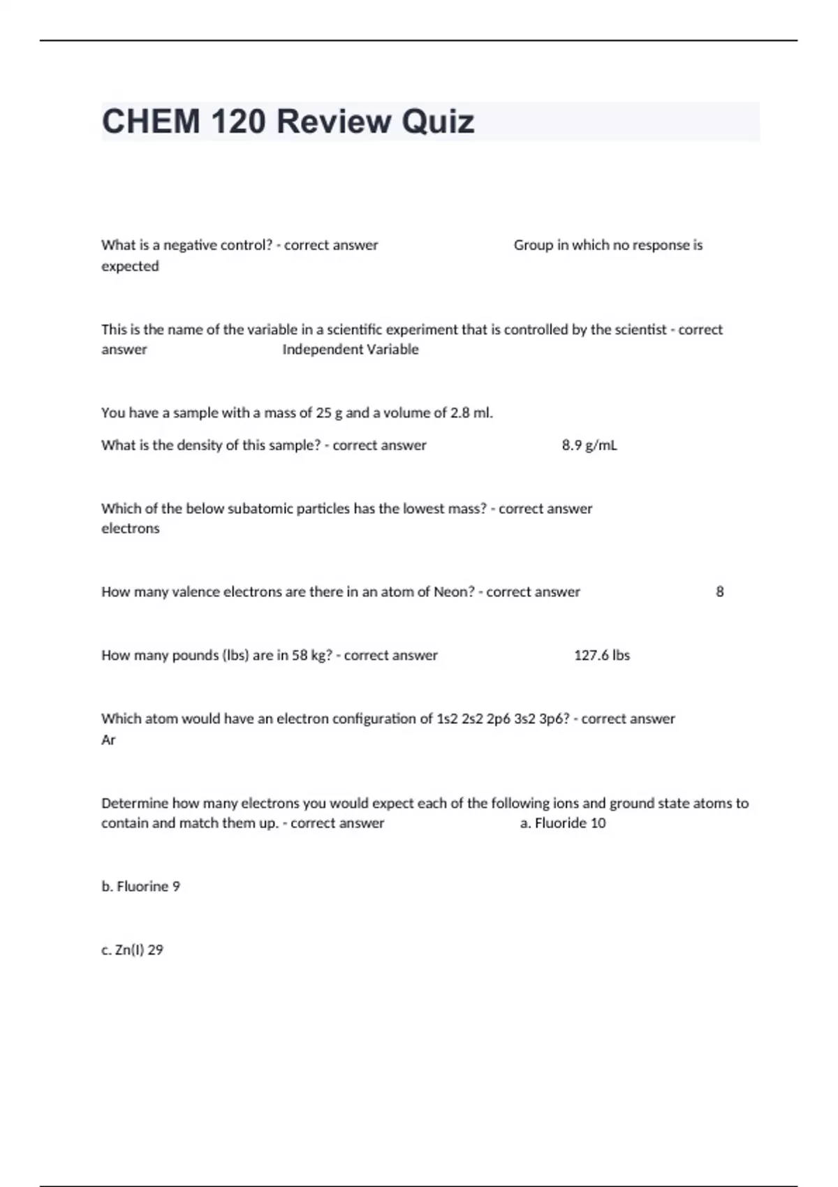 What is a negative control? - correct answer Group in which no response is expected This is the name of the variable in a scientific experiment that is controlled by the scientist - correct answer Independent Variable You have a sample with a mass of 25 g and a volume of 2.8 ml. What is the density of this sample? - correct answer 8.9 g/mL Which of the below subatomic particles has the lowest mass? - correct answer electrons How many valence electrons are there in an atom of Neon? - correct answer 8 How many pounds (lbs) are in 58 kg? - correct answer 127.6 lbs Which atom would have an electron configuration of 1s2 2s2 2p6 3s2 3p6? - correct answer Ar Determine how many electrons you would expect each of the following ions and ground state atoms to contain and match them up. - correct answer a. Fluoride 10 b. Fluorine 9 c. Zn(I) 29 d. Calcium ion 18 A ground state atom (uncharged atom) gains 3 electrons. This atom will now have a charge of: - correct answer -3 What is the correct Lewis Dot Structure for Phosphorous? - correct answer .. .P. . What would be the chemical formula for Strontium Chloride? - correct answer SrCl2 What is the chemical formula of Dinitrogen Tetroxide? - correct answer N2O4 What are valance electrons? - correct answer The outermost electrons All isotopes of Oxygen must have - correct answer 8 protons A neutron has (select all that apply) - correct answer A charge of 0 How many protons do all isotopes of Cu have? - correct answer 29 If an isotope of Li contains 5 neutrons, what is the mass number of this isotope of Li? - correct answer 8 Select all of the following molecules that you would expect to have the Trigonal Pyramidal shape. (select all that apply) - correct answer PF3 NH3 All isotopes of an atom MUST share the same - correct answer Number of protons Select all formulas that would be considered to be ionic compounds - correct answer NaNO2 AlF3 FeBr2 Match each of the following bonds with the electron behavior observed. - correct answer Polar covalent bond Electrons are shared unequally b. Nonpolar covalent bond Electrons are shared equally c. Ionic Bond Electrons are transferred from one atom to another