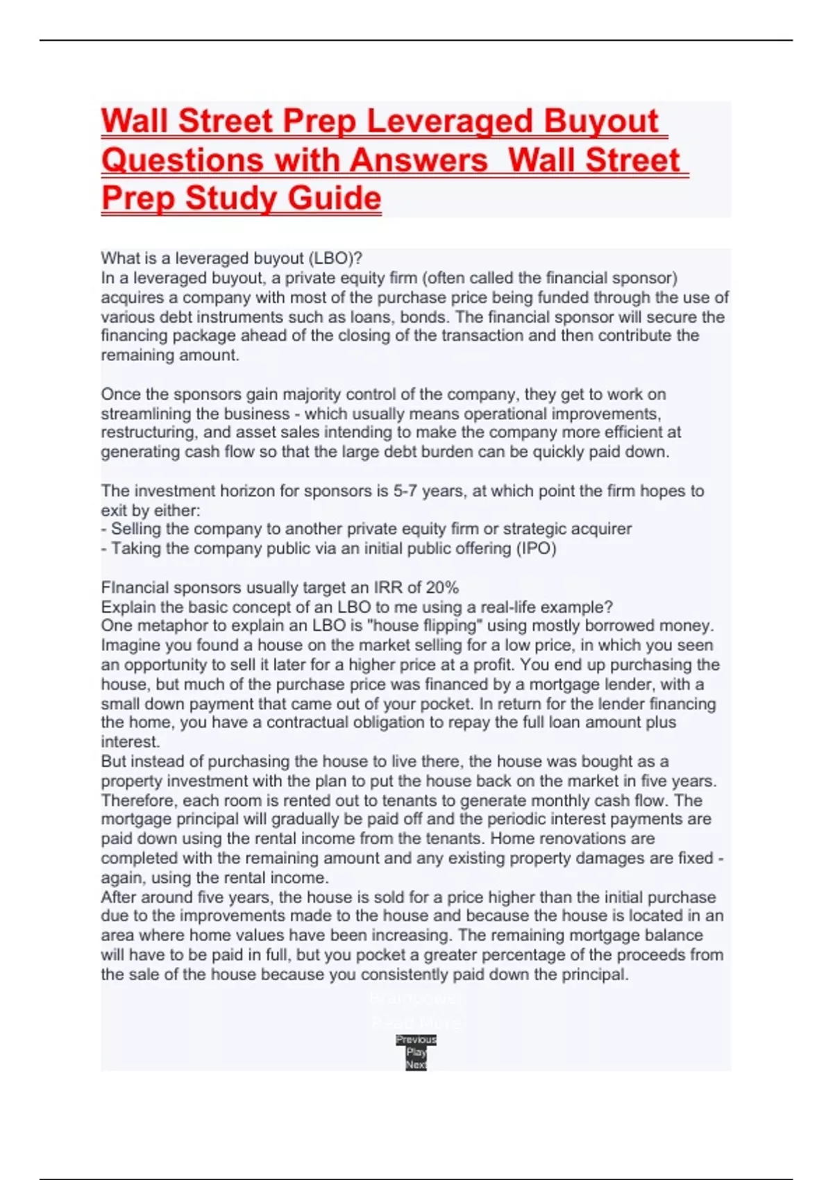Wall Street Prep Leveraged Buyout Questions with Answers Wall Street Prep Study Guide.