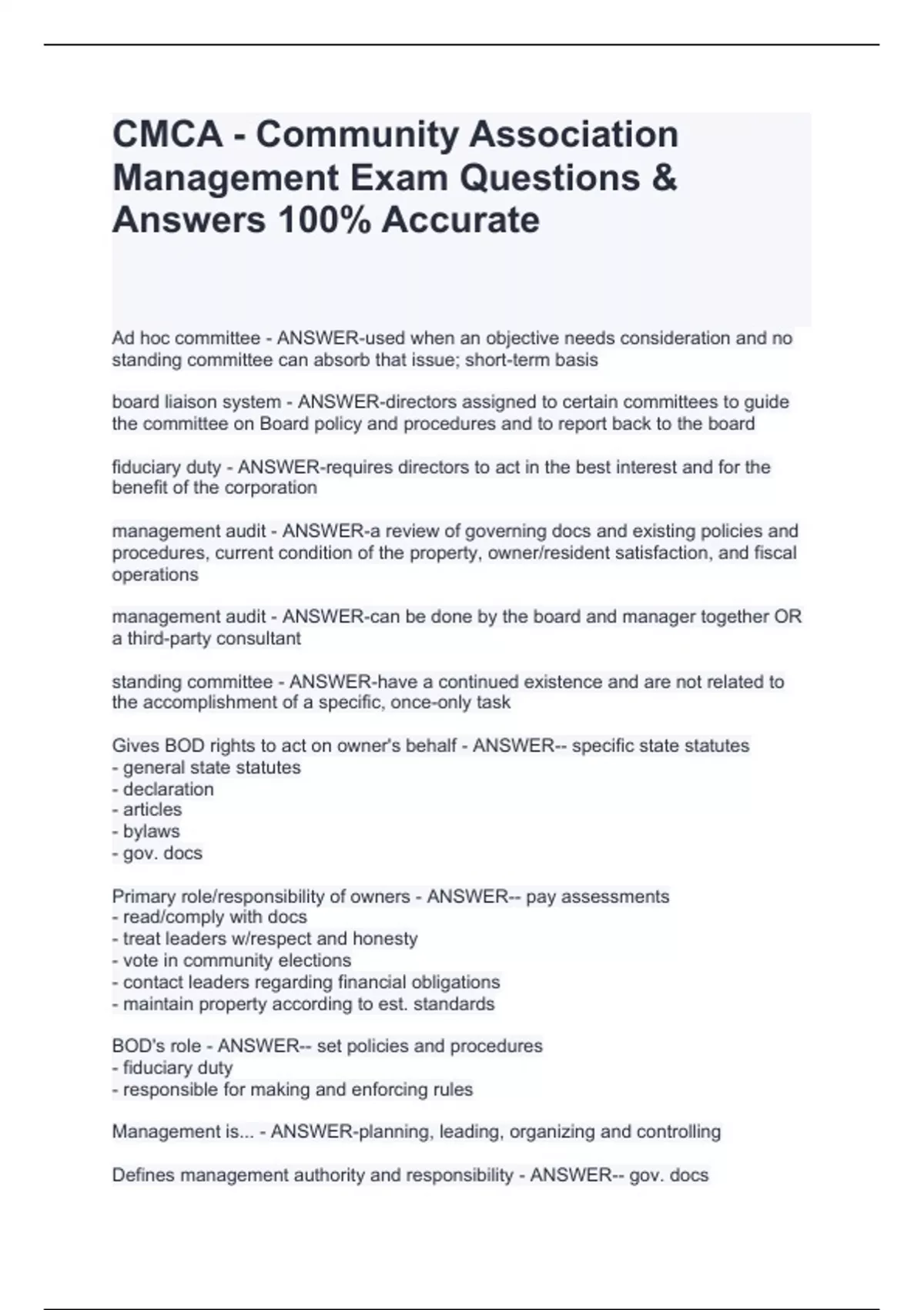board liaison system - ANSWER-directors assigned to certain committees to guide the committee on Board policy and procedures and to report back to the board fiduciary duty - ANSWER-requires directors to act in the best interest and for the benefit of the corporation management audit - ANSWER-a review of governing docs and existing policies and procedures, current condition of the property, owner/resident satisfaction, and fiscal operations management audit - ANSWER-can be done by the board and manager together OR a third-party consultant standing committee - ANSWER-have a continued existence and are not related to the accomplishment of a specific, once-only task Gives BOD rights to act on owner's behalf - ANSWER-- specific state statutes - general state statutes - declaration - articles - bylaws - gov. docs Primary role/responsibility of owners - ANSWER-- pay assessments - read/comply with docs - treat leaders w/respect and honesty - vote in community elections - contact leaders regarding financial obligations - maintain property according to est. standards BOD's role - ANSWER-- set policies and procedures - fiduciary duty - responsible for making and enforcing rules Management is... - ANSWER-planning, leading, organizing and controlling Defines management authority and responsibility - ANSWER-- gov. docs - management contract - employment agreement - actions of the BOD which delegate specific authority and duties