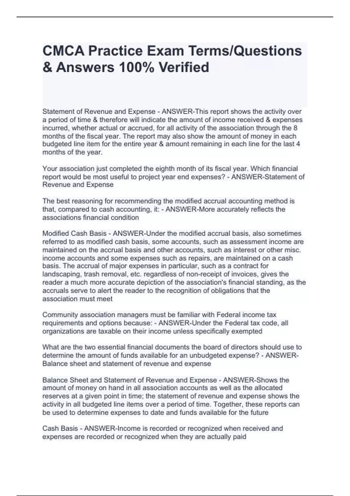 Your association just completed the eighth month of its fiscal year. Which financial report would be most useful to project year end expenses? - ANSWER-Statement of Revenue and Expense The best reasoning for recommending the modified accrual accounting method is that, compared to cash accounting, it: - ANSWER-More accurately reflects the associations financial condition Modified Cash Basis - ANSWER-Under the modified accrual basis, also sometimes referred to as modified cash basis, some accounts, such as assessment income are maintained on the accrual basis and other accounts, such as interest or other misc. income accounts and some expenses such as repairs, are maintained on a cash basis. The accrual of major expenses in particular, such as a contract for landscaping, trash removal, etc. regardless of non-receipt of invoices, gives the reader a much more accurate depiction of the association's financial standing, as the accruals serve to alert the reader to the recognition of obligations that the association must meet Community association managers must be familiar with Federal income tax requirements and options because: - ANSWER-Under the Federal tax code, all organizations are taxable on their income unless specifically exempted What are the two essential financial documents the board of directors should use to determine the amount of funds available for an unbudgeted expense? - ANSWER-Balance sheet and statement of revenue and expense Balance Sheet and Statement of Revenue and Expense - ANSWER-Shows the amount of money on hand in all association accounts as well as the allocated reserves at a given point in time; the statement of revenue and expense shows the activity in all budgeted line items over a period of time. Together, these reports can be used to determine expenses to date and funds available for the future Cash Basis - ANSWER-Income is recorded or recognized when received and expenses are recorded or recognized when they are actually paid