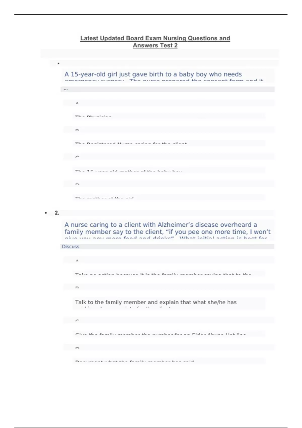 Latest Updated Board Exam Nursing Questions and Answers Test 2 2. Discuss 3. Which is true about informed consent? Discuss oA. A nurse may accept responsibility signing a consent form if the client is unable oB. Obtaining consent is not the responsibility of the physician oC. oD. 4. Discuss oA. oB. Get a court order making the baby a ward of the court oC. oD. Do nothing except record the mother’s statement in the medical record 5. oA. The patient releases the physician from all responsibility for the procedure. oB. The immediate family may make decision against the patient’s will. oC. oD. 6. oA. Call a family meeting oB. Discuss the religious beliefs with the physician 7. Discuss Tell them it is not appropriate to discuss the condition of the client Ignore them, because it is their right to discuss anything they want to Join in the conversation, giving them supportive input about the case of the client Report this incident to the nursing supervisor 8. Discuss this with the supervisor Not discuss the issue with anyone. It will probably resolve itself Tell other members of the network what the team member did 9. Discuss oA. oB. The client asks the nurse to discuss the her condition with the family oC. oD. 10. Discuss oA. Call the surgeon oB. Ask the spouse to sign the consent oC. Obtain a consent from the client as soon as possible Get a verbal consent from the parents of the client