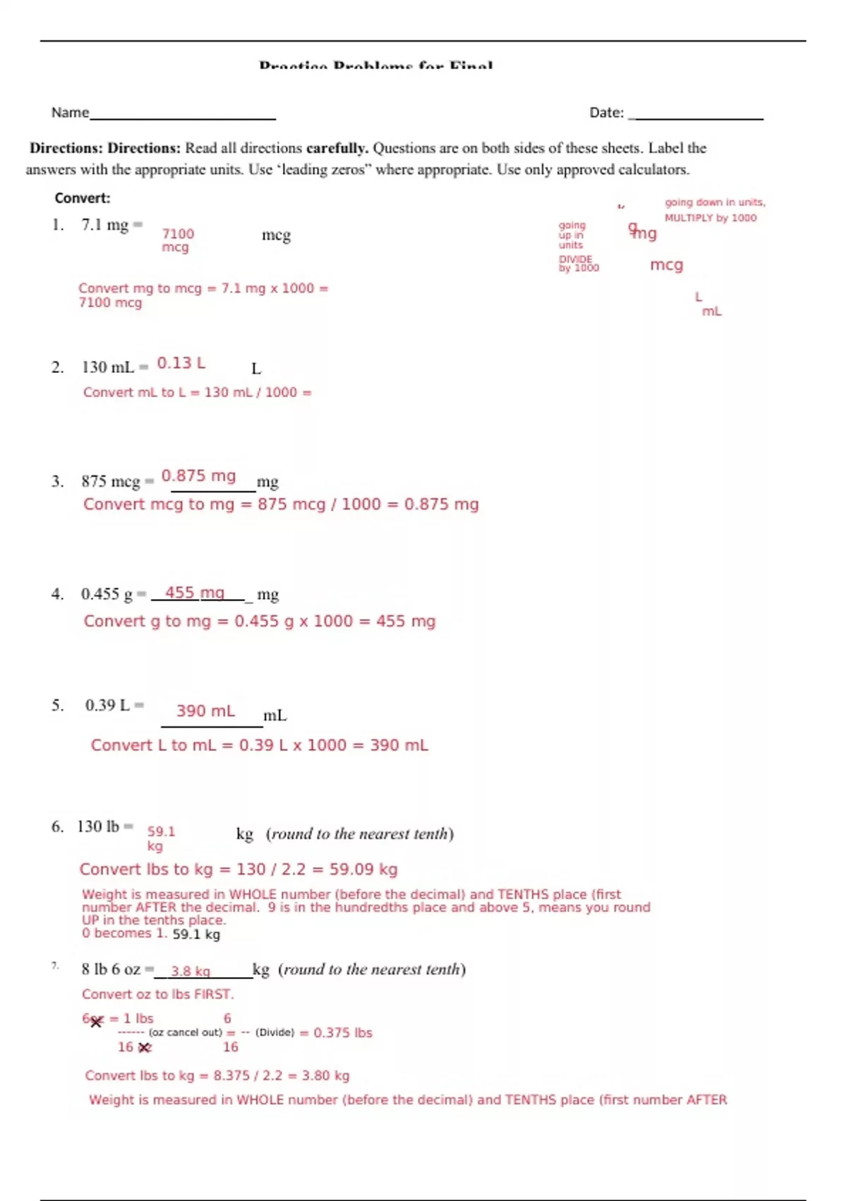 Directions: Directions: Read all directions carefully. Questions are on both sides of these sheets. Label the answers with the appropriate units. Use ‘leading zeros” where appropriate. Use only approved calculators. Convert: 1. 7.1 mg = 7100 mcg mcg going up in units going down in units, g MULTIPLY by 1000 mg Convert mg to mcg = 7.1 mg x 1000 = 7100 mcg DIVIDE by 1000 mcg L mL 2. 130 mL = 0.13 L L Convert mL to L = 130 mL / 1000 = 3. 875 mcg = 0.875 mg mg Convert mcg to mg = 875 mcg / 1000 = 0.875 mg 4. 0.455 g = 455 mg _ mg Convert g to mg = 0.455 g x 1000 = 455 mg 5. 0.39 L = 390 mL mL Convert L to mL = 0.39 L x 1000 = 390 mL 6. 130 lb = 59.1 kg kg (round to the nearest tenth) Convert lbs to kg = 130 / 2.2 = 59.09 kg Weight is measured in WHOLE number (before the decimal) and TENTHS place (first number AFTER the decimal. 9 is in the hundredths place and above 5, means you round UP in the tenths place. 0 becomes 1. 59.1 kg 7.8 lb 6 oz = 3.8 kg kg (round to the nearest tenth) Convert oz to lbs FIRST. 6oz = 1 lbs 6 ------ (oz cancel out) = -- (Divide) = 0.375 lbs 16 oz 16 Convert lbs to kg = 8.375 / 2.2 = 3.80 kg Weight is measured in WHOLE number (before the decimal) and TENTHS place (first number AFTER the decimal. 0 is in the hundredths place and below 5, means the tenths place will stay the same number. 3.8 kg 8.The physician’s order reads Vibramycin 100 mg PO twice a day. Supply: How many mL will the patient receive per dose? 20 mL/dose mL A=D --- x Q = 100 mg 100 H x 5 mL (mg cancel out) 25 mg ----- (Divide) = 4 x 5 mL = 20 mL 25 9.The physician orders Decadron 0.75 mg PO q12h . The medication is supplied as 0.25 mg tablets How many tablets will the nurse administer per dose? 3 tablets/dose tablets A=D ---xQ = 0.75 mg H (Divide)(mg cancel out) x Tablet = 3 tablets 0.25 mg 10.Lactated Ringer’s solution 1000 mL is to be infused over 16 hours. How many milliliters per hour should the IV fluids be infused? 63 mL/h FR=V -- = 1000 mL mL/h (Round your answer to the nearest whole number) T ----------- (Divide) = 62.5 mL/h 16 hours (Round to your nearest WHOLE number (Number before the decimal). 5 is in the tenths place, meansyou round UP in the whole number. 63 mL/h 11.A child weighing 12 lb has an order for Phenobarbital 10 mg POq12h. The recommended dosage is 3-5 mg/kg/day divided q12h . Phenobarbital elixir is available as 20 mg/ 5mL. a.What is the client’s weight in kilograms? 5.5 kg (round to the nearest tenth) Convert lbs to kg = 12 / 2.2 = 5.45 kg (Weight is measured in WHOLE number (number before the decimal and the tenths place (first number after the decimal. 5 is in the hundredths place, means you round UP. 4 becomes 5.) 5.5 kg b.What is the safe 24-hour dosage range for this child? 16.5-27.5 mg/day Multiply kg weight by recommended dosage 5.5 x 3 = 16.5 mg/day 5.5 x 5 = 27.5 mg/day c.Is the dosage ordered safe? (YES or NO, Prove mathematically – be specific) YES Multiple order = 10 mg x 2 (times per day) = 20 mg/day Dosage is SAFE because it falls in the range of 16.5-27.5 mg/day d. If the ordered dosage safe how many mL will the nurse administer? If the ordered dosage not safe what nursing intervention is needed? 2.5 mL/dose A=D --- x Q = 10 mg H (Divide) (mg cancel out) x 5 mL = 2.5 mL/dose 20 mg 12.A patient has an order Lopressor 25 mg po twice a day. The medication is available as Lopressor scored tablets 50 mg. How many tablets should the patient receive per dose? 0.5 tablets/dose tablets A=D ---x Q = 25 mg H (Divide)(mg cancel out) x tablet = 0.5 tablets/dose 50 mg 13.Calculate the morning fluid intake for the following client in mL: Breakfast: 2 sliced apples, 12 ounces of water, 1/3 cup of milk and 8 ounces of coffee. ****You cannot calculate apple slices (Don't get caught up on this. It cannot be measured in mL. It is a way to test you.**** Water = 12 oz = 30 mL -------- (oz cancel out)(Multiply) = 360 mL 1 oz 1 8 oz 30 mL = 240 Add = 360 80 Milk = - cup x ------ x (cups and oz cancel out)(Multiply) ----- (Divide) = 240 3 1 cup 1 oz ------ 3 680 mL total Coffee = 8 oz x 30 mL -------- (oz cancel out)(Multiply) = 1 oz 680 mL mL 14.The prescriber orders Lasix (furosemide) 20 mg IM mg stat. Available: How many mL will the patient receive per dose? 2 mL/dose mL A=D --- x Q= 20 mg H -------- (mg cancel out)(Divide) x 4 mL = 2 mL/dose 40 mg 15.A physician orders 15 mg of Codeine IM q 4 hours prn for pain. A 20 mL vial with a concentration of 100 mg/ mL is available. How many milliliters should the patient receive per dose? 0.15 mL/dose mL A= D --- x Q = 15 mg H (mg cancel out)(Divide) x mL = 0.15 mL/dose 100 mg 16.Doctor’s order reads Heparin 8000 units subcut q8h. Heparin is available as 10000 units/mL solution. How many mL should the patient receive per dose? A=D -- x Q= 8000 units 0.8 mL H (units cancel out)(Divide) x mL = 0.8 mL mL 10000 units 17.A physician orders Allopurinol 0.25 g PO every day. Medication available is Allopurinol scored tablets labeled 100 mg.. How many tablets should the patient receive per dose? Order is in grams. FIRST convert g to mg. 0.25 g x 1000 = 250 mg A= D --- xQ= 250 mg H (mg cancel out)(Divide) x tablet = 2.5 tablets 100 mg 2.5 tablets/dose tablets 18.Acetaminophen elixir 10 mg/ kg is ordered for a child weighing 14 kg. Medication available is Acetaminophen elixir 160 mg/5 mL. How many mL should the patient receive per dose? PAY ATTENTION!!! The weight is already in KG. You do not need to convert the weight! Multiply 14 kg x 10 mg = 140 mg A=D --x Q = 140 mg H (mg cancel out)(Divide) x 5 mL = 4.375 mg/dose 160 mg (Round to nearest tenth (First number after the decimal. 7 is in hundredths place, means you round UP in tenths. 3 becomes 4. 4.4 mg/dose mL (Round your answer to the nearest tenth) 4.4 mg/dose 19.The prescriber orders Zofran 8 mg PO before chemotherapy. Zofran is available as 4 mg 5/mL solution. How many teaspoons should the patient receive per dose? A=D -- x Q = 8 mg 10 mL = 1 t ---- (mL cancel out)(Divide) = 10 = 