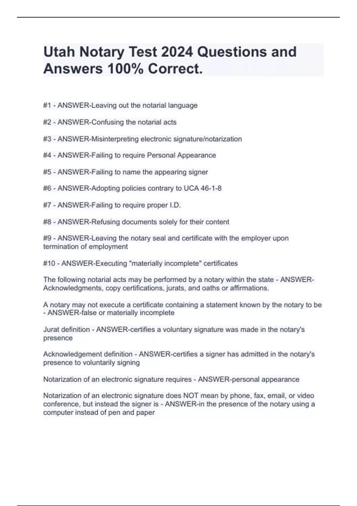 Utah Notary Test 2024 Questions and Answers 100% Correct.