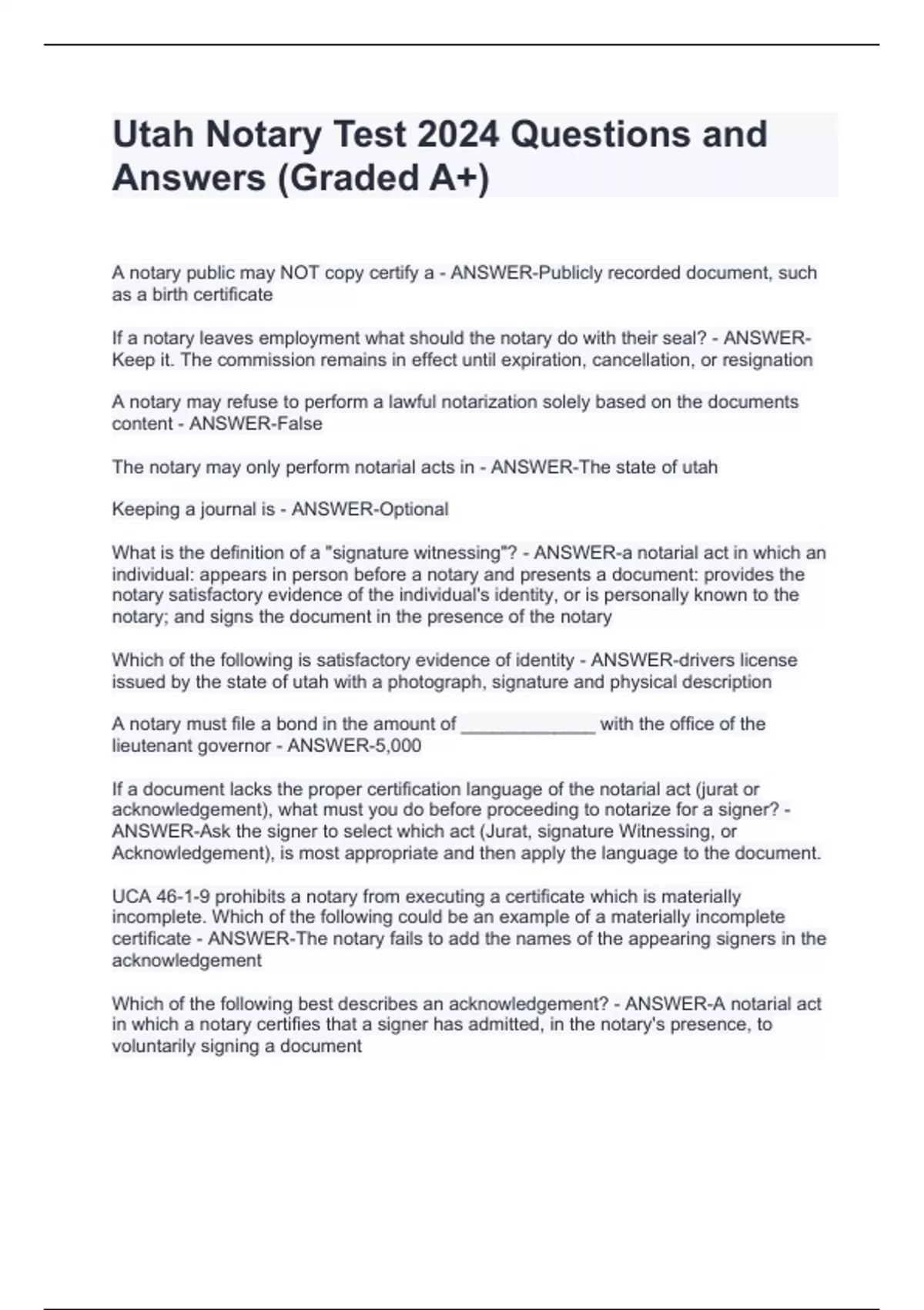 Utah Notary Test 2024 Questions and Answers (Graded A+)