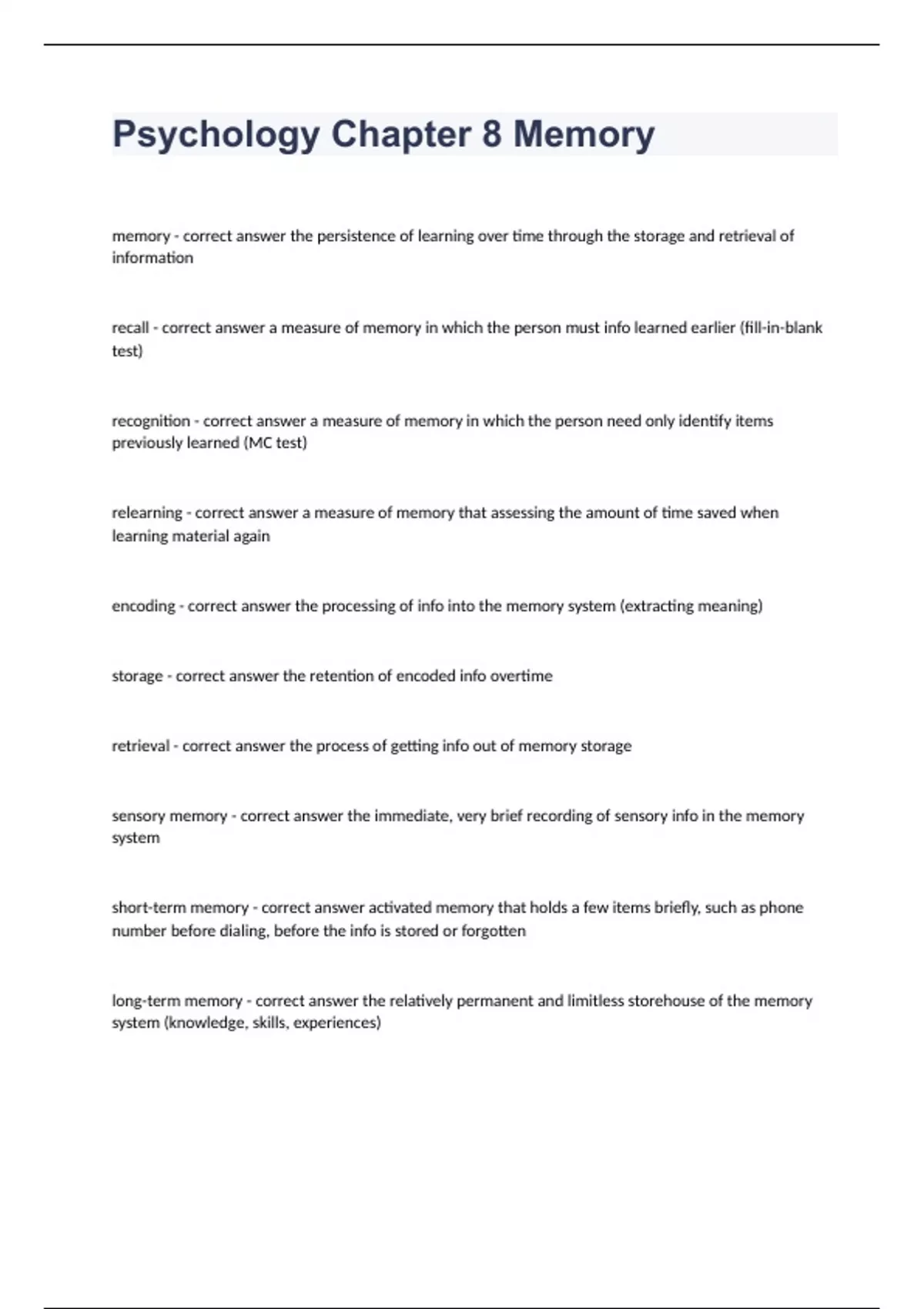 Psychology Chapter 8 Memory questions and answers verified 2024