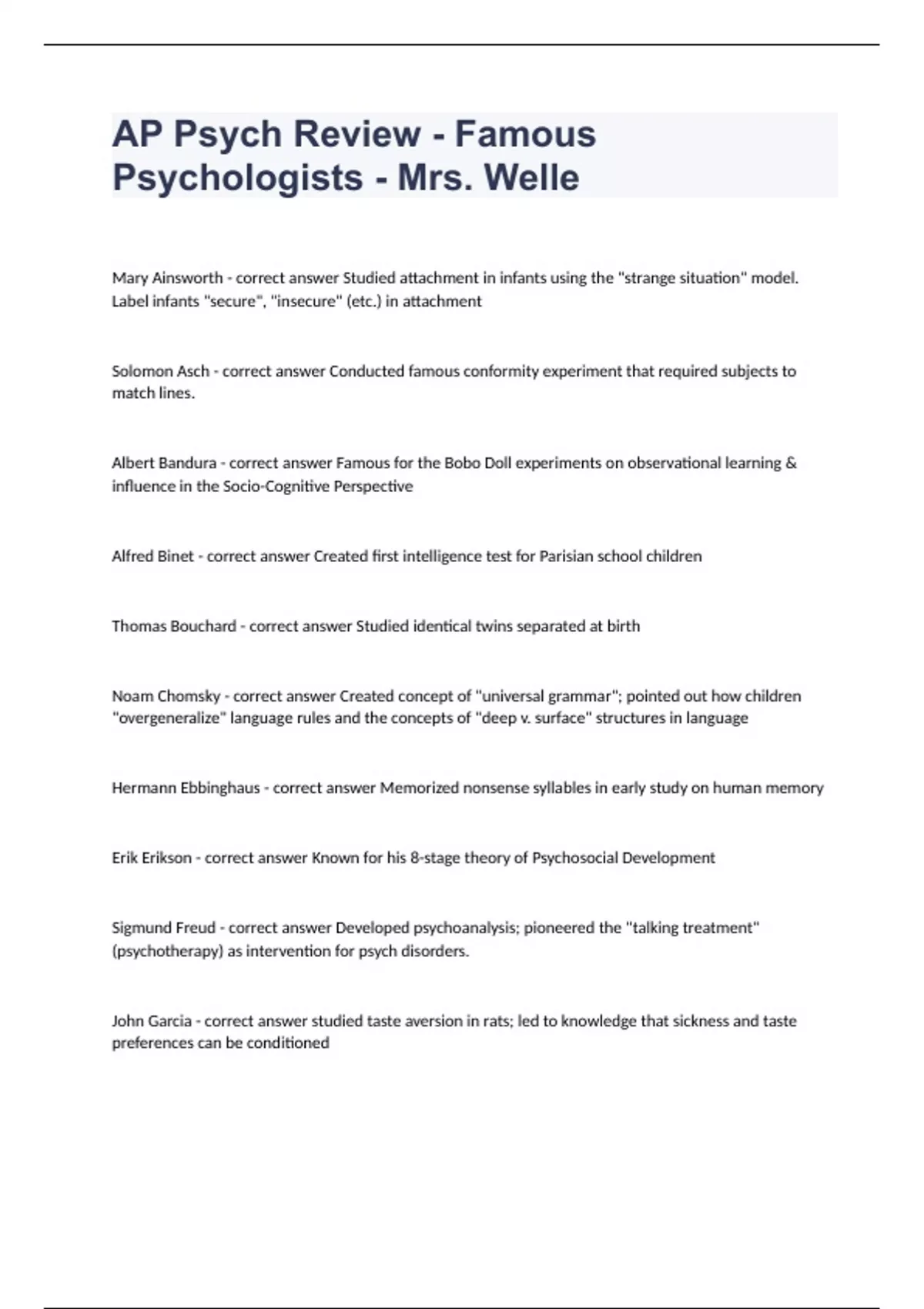 AP Psych Review - Famous Psychologists - Mrs. Welle questions and answers rated A+ 2024