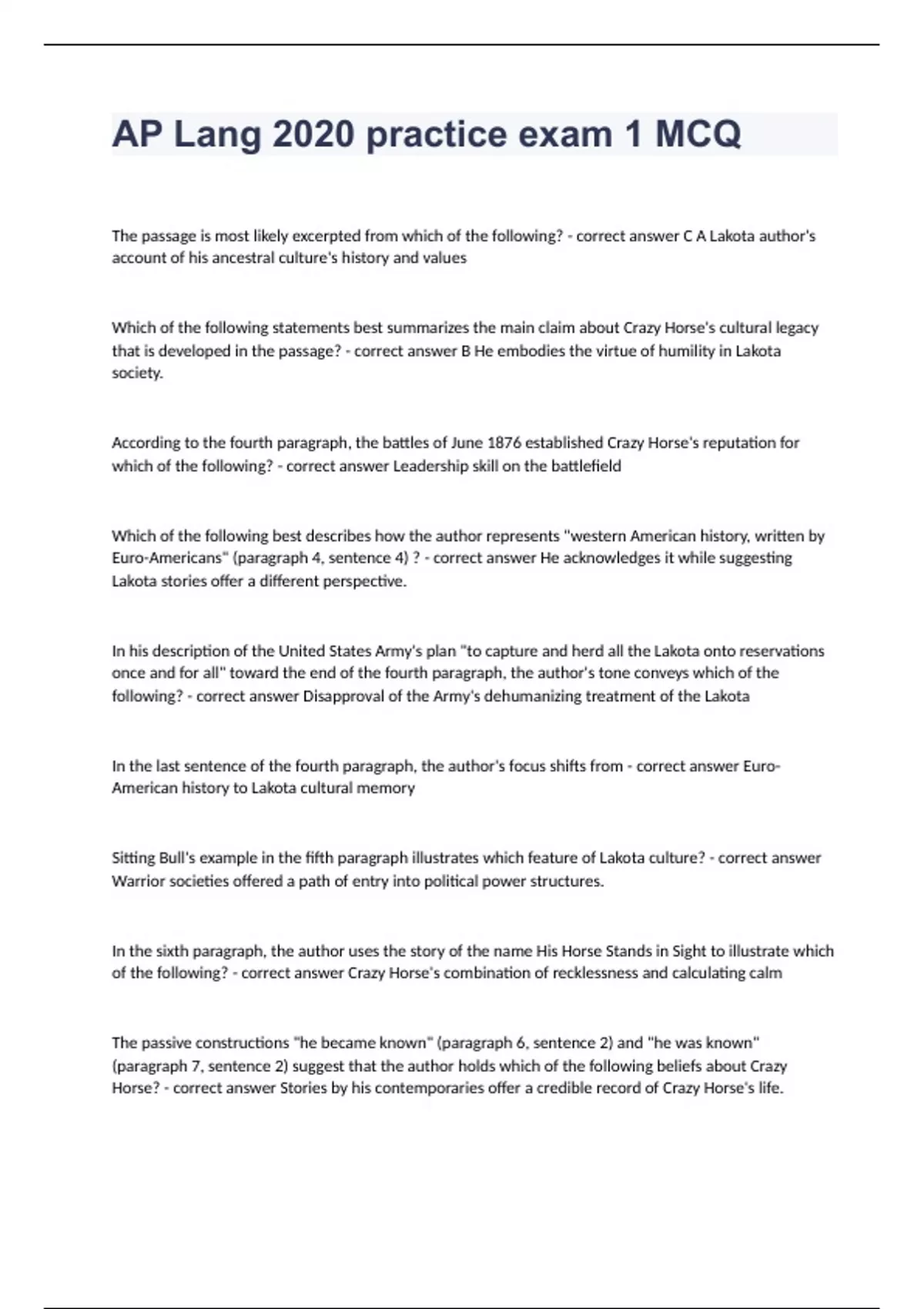 AP Lang 2020 practice exam 1 MCQ questions and answers already solved 2024