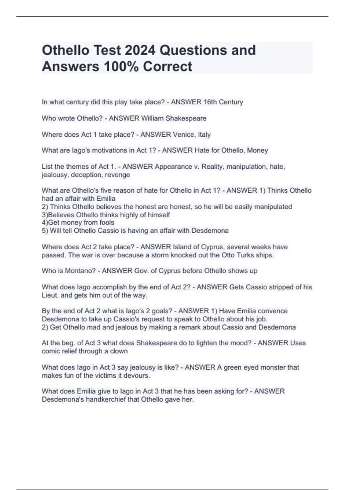 Othello Test 2024 Questions and Answers 100% Correct Othello Test 2024 Questions and Answers 100% Correct Othello Test 2024 Questions and Answers 100% Correct Othello Test 2024 Questions and Answers 100% Correct Othello Test 2024 Questions and Answers 100% Correct In what century did this play take place? - ANSWER 16th Century Who wrote Othello? - ANSWER William Shakespeare Where does Act 1 take place? - ANSWER Venice, Italy What are Iago's motivations in Act 1? - ANSWER Hate for Othello, Money
