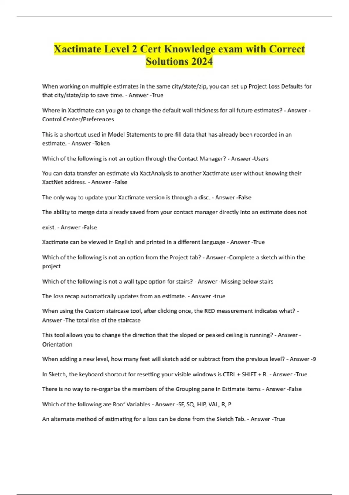 Xactimate Level 2 Cert Knowledge exam with Correct Solutions 2024 When working on multiple estimates in the same city/state/zip, you can set up Project Loss Defaults for that city/state/zip to save time. - Answer -True Where in Xactimate can you go to change the default wall thickness for all future estimates? - Answer - Control Center/Preferences This is a shortcut used in Model Statements to pre-fill data that has already been recorded in an estimate. - Answer -Token Which of the following is not an option through the Contact Manager? - Answer -Users You can data transfer an estimate via XactAnalysis to another Xactimate user without knowing their XactNet address. - Answer -False The only way to update your Xactimate version is through a disc. - Answer -False The ability to merge data already saved from your contact manager directly into an estimate does not exist. - Answer -False Xactimate can be viewed in English and printed in a different language - Answer -True Which of the following is not an option from the Project tab? - Answer -Complete a sketch within the project Which of the following is not a wall type option for stairs? - Answer -Missing below stairs The loss recap automatically updates from an estimate. - Answer -true When using the Custom staircase tool, after clicking once, the RED measurement indicates what? - Answer -The total rise of the staircase This tool allows you to change the direction that the sloped or peaked ceiling is running? - Answer - Orientation When adding a new level, how many feet will sketch add or subtract from the previous level? - Answer -9 In Sketch, the keyboard shortcut for resetting your visible windows is CTRL + SHIFT + R. - Answer -True There is no way to re-organize the members of the Grouping pane in Estimate Items - Answer -Fals