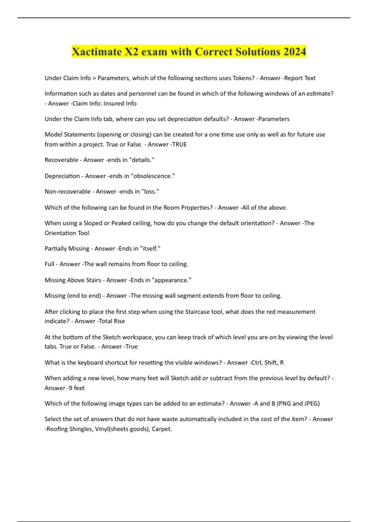 Xactimate X2 exam with Correct Solutions 2024 Under Claim Info > Parameters, which of the following sections uses Tokens? - Answer -Report Text Information such as dates and personnel can be found in which of the following windows of an estimate? - Answer -Claim Info: Insured Info Under the Claim Info tab, where can you set depreciation defaults? - Answer -Parameters Model Statements (opening or closing) can be created for a one time use only as well as for future use from within a project. True or False. - Answer -TRUE Recoverable - Answer -ends in "details." Depreciation - Answer -ends in "obsolescence." Non-recoverable - Answer -ends in "loss." Which of the following can be found in the Room Properties? - Answer -All of the above. When using a Sloped or Peaked ceiling, how do you change the default orientation? - Answer -The Orientation Tool Partially Missing - Answer -Ends in "itself." Full - Answer -The wall remains from floor to ceiling. Missing Above Stairs - Answer -Ends in "appearance." Missing (end to end) - Answer -The missing wall segment extends from floor to ceiling. After clicking to place the first step when using the Staircase tool, what does the red measurement indicate? - Answer -Total Rise At the bottom of the Sketch workspace, you can keep track of which level you are on by viewing the level tabs. True or False. - Answer -True What is the keyboard shortcut for resetting the visible windows? - Answer -Ctrl, Shift, R When adding a new level, how many feet will Sketch add or subtract from the previous level by default? - Answer -9 feet Which of the following image types can be added to an estimate? - Answer -A and B (PNG and JPEG