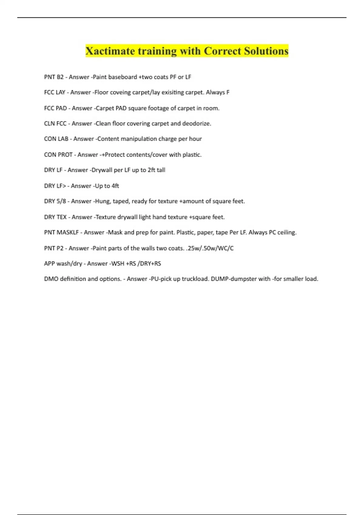 Xactimate training with Correct Solutions PNT B2 - Answer -Paint baseboard +two coats PF or LF FCC LAY - Answer -Floor coveing carpet/lay exisiting carpet. Always F FCC PAD - Answer -Carpet PAD square footage of carpet in room. CLN FCC - Answer -Clean floor covering carpet and deodorize. CON LAB - Answer -Content manipulation charge per hour