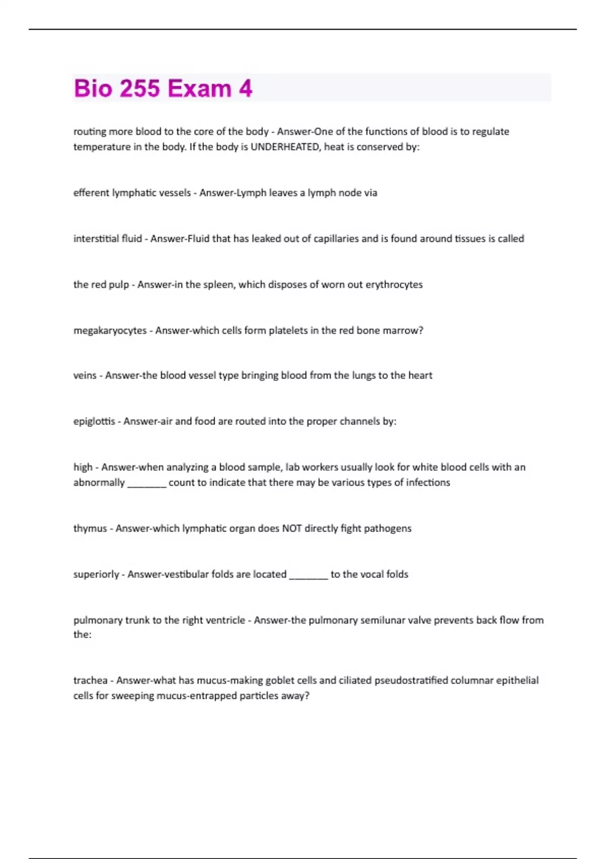 routing more blood to the core of the body - Answer-One of the functions of blood is to regulate temperature in the body. If the body is UNDERHEATED, heat is conserved by: efferent lymphatic vessels - Answer-Lymph leaves a lymph node via interstitial fluid - Answer-Fluid that has leaked out of capillaries and is found around tissues is called the red pulp - Answer-in the spleen, which disposes of worn out erythrocytes megakaryocytes - Answer-which cells form platelets in the red bone marrow? veins - Answer-the blood vessel type bringing blood from the lungs to the heart