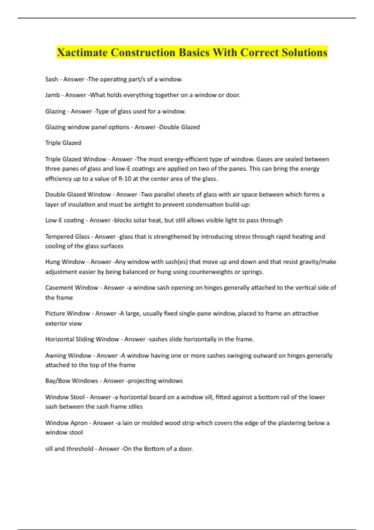 Sash - Answer -The operating part/s of a window. Jamb - Answer -What holds everything together on a window or door. Glazing - Answer -Type of glass used for a window. Glazing window panel options - Answer -Double Glazed Triple Glazed Triple Glazed Window - Answer -The most energy-efficient type of window. Gases are sealed between three panes of glass and low-E coatings are applied on two of the panes. This can bring the energy efficiency up to a value of R-10 at the center area of the gl